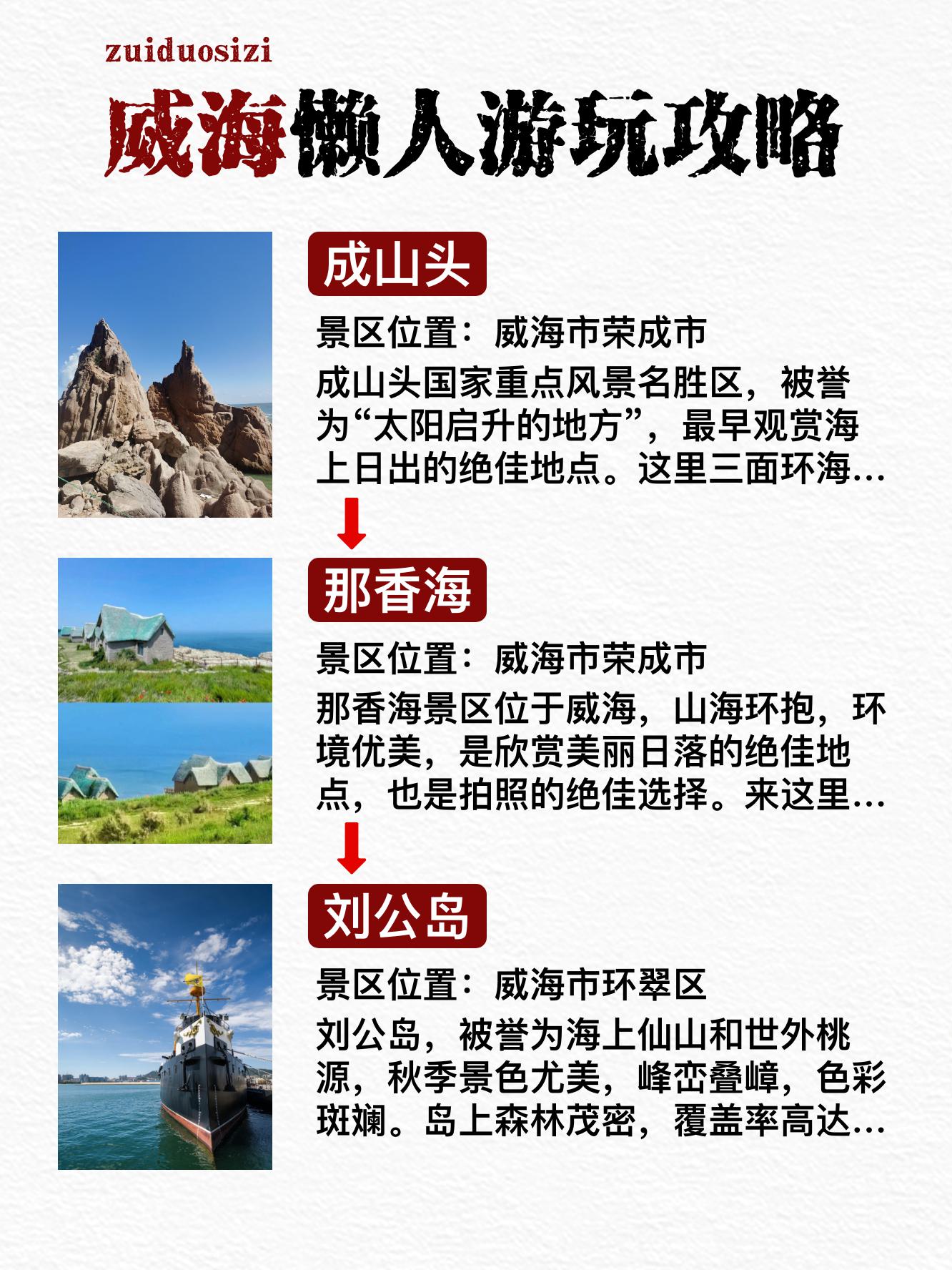 11、希望以上攻略能对您的旅行有所帮助1 有很多值得一游的景点2 威海站附近有许多著名的景点,如威海国际海洋公园威海荣成九龙山威海刘公岛等这些景点都有独特的自然风光和人文历史,吸引着众多游客前来观光和游玩3 此外,威海还有许多美丽的海滩和海岛,如威海海滨浴场威海大观园等,可以。