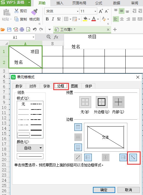 1选中需要加斜线的单元格2单击开始格式单元格,如图所示3弹出单元格格式对话框,选择边框选项卡,单击右侧的斜线按钮,设置斜线,如图所示4在该单元格中输入姓名科目,选中科目,单击开始选项卡右下角的按钮,如图所示5弹出单元格格式对话框,在字号处选择16号注姓名的。