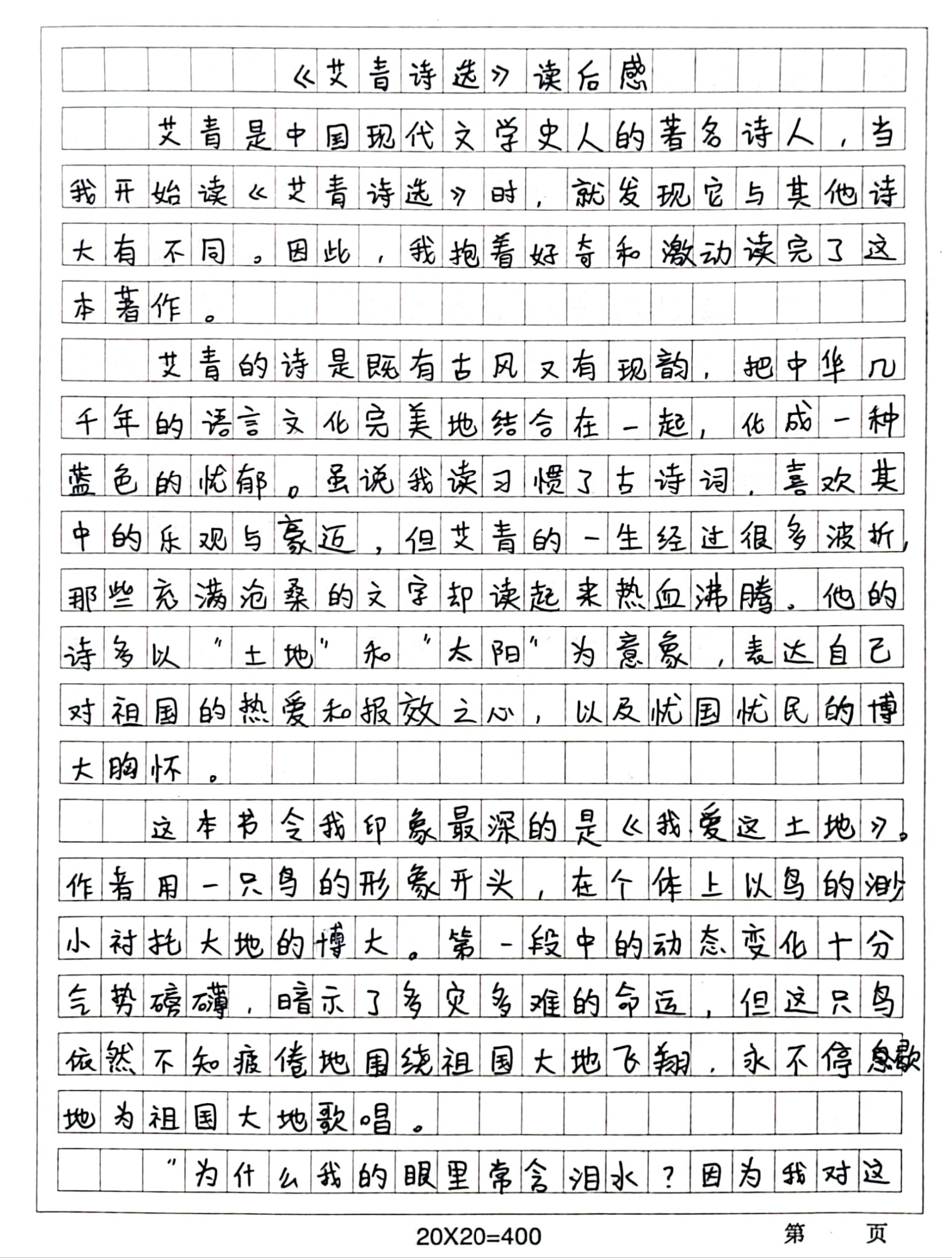 9、艾青诗选读后感初三10篇 艾青诗选以革命的现实主义手法,深沉忧郁地唱出了祖国的土地和人民所遭受的苦难和不幸,下面就是我整理的艾青诗选读后感初三10篇,希望大家喜欢 艾青诗选读后感初三1 近来颇有闲暇,翻书柜时不经意就看见了蒙上一层灰的艾青诗选,轻轻拂去灰尘,抱着好奇的心态随手翻了几页,就被“世间最温暖的诗quot这七个字。