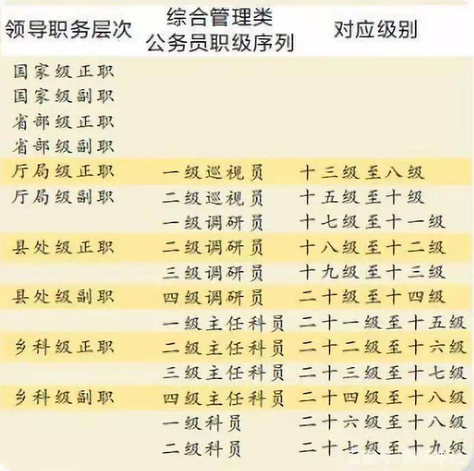 4、我们再来说说调研员调研员与巡视员相类似,也是国家公务员的一种,只不过在级别上要低于巡视员,在行政级别上属于县处级这个级别调研员按照等级共分为一二三四,四个等级按照晋升的惯例来说,一般而言,晋升一级调研员,需要任处级正职或二级调研员3年以上晋升二级调研员,需要任三级调研员2年以上;调研员一二三四级在级别职责待遇和晋升条件上均有所不同级别一级调研员对应的级别为十七级至十一级,是调研员职级中的最高级别二级调研员对应的级别为十八级至十二级,仅次于一级调研员三级调研员对应的级别为十九级至十三级,位于调研员职级的中层四级调研员对应的级别为二十级至十四级;一二三四级调研员是中国公务员系统中的专业技术职务级别,具体级别及对应情况如下一级调研员级别一级调研员是专业技术职务中的最高级别,相当于正高级专业技术职务特点通常具有丰富的工作经验和高超的专业技术能力,是公务员队伍中的佼佼者二级调研员级别二级调研员仅次于一级调研员,属于副高。