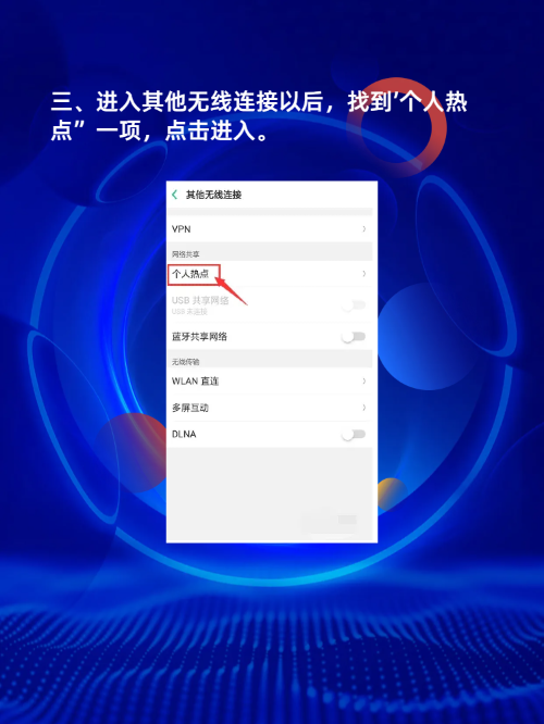 选择“网络共享和便捷式热点设置”菜单WIFI热点默认关闭,点击开启WIFI设置热点名称和密码 可以设置热点的名称,方便另一台手机识别WIFI热点有默认密码,一般较复杂,可直接在手机上设置成简单密码,便于记忆和输入另一台手机连接热点 打开没有流量的手机,进入WIFI设置界面搜索附近的WIFI网络,找到。