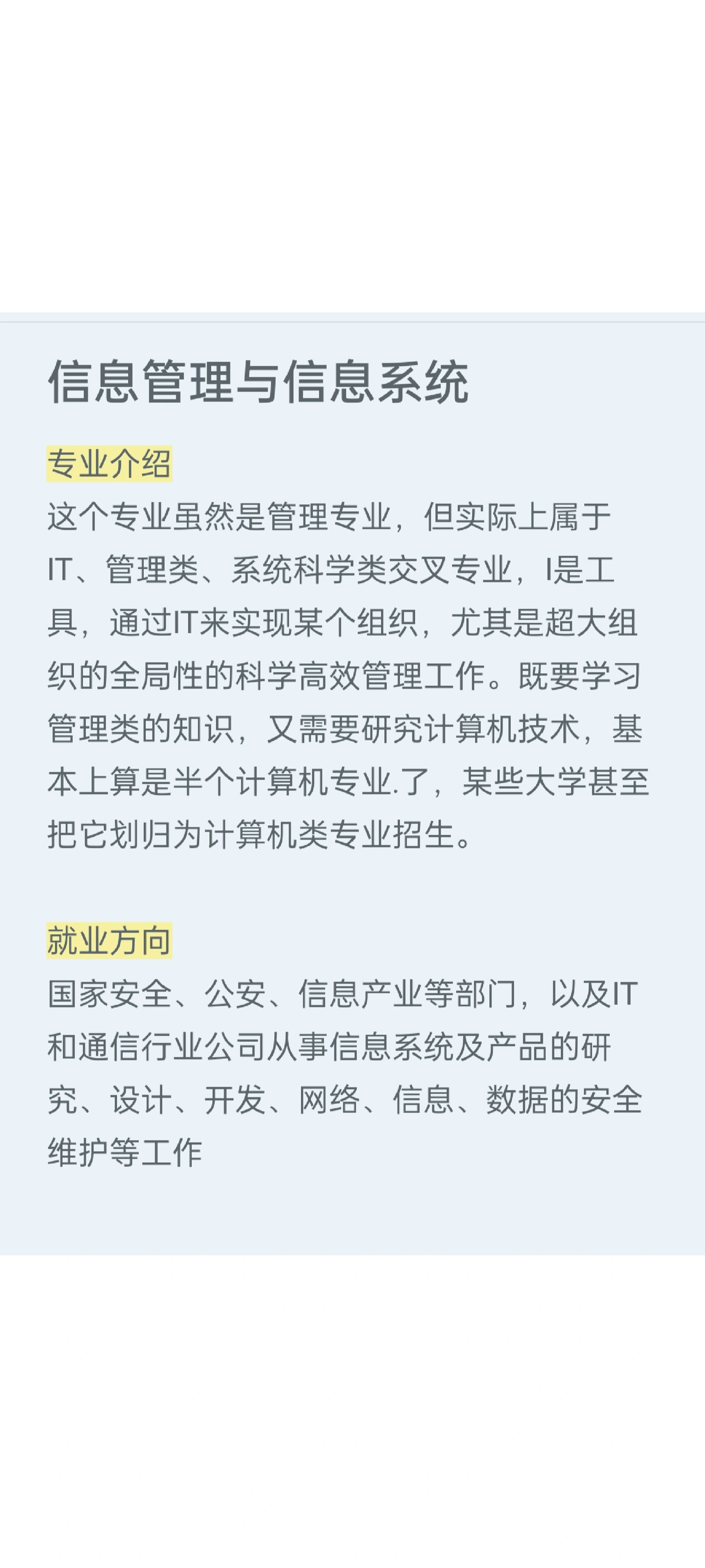 随着大数据人工智能等新技术的应用,医学信息管理专业面临着更多新的机遇和挑战这要求毕业生不断提升自己的专业技能和综合素质,以更好地适应未来就业市场的需求综上所述,医学信息管理与信息系统专业是一个充满机遇和发展潜力的专业领域,对于那些对医疗行业和技术感兴趣的学生来说,这是一个值得考虑;符合社会的迫切需求 职业发展方向多样毕业生可以在政府部门企业金融机构科研单位等多个领域从事信息管理信息系统开发项目管理等工作,职业发展前景广阔综上所述,信息管理与信息系统专业结合了管理学与计算机科学,课程设置全面,就业前景较好,是一个值得考虑的专业选择。