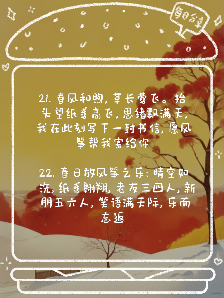 1我的大红的金鱼风筝,鼓着圆圆的眼睛注视沙滩上来来往往的行人,是那么畅快2闻着梅香,有一株玉兰早早地开了,阳光甚好,直到夕阳余晖,散步回家3天上的风筝飞呀飞地上的人儿追呀追 4你就像一只折断的风筝期待着飞向更高的天空,所以你选择放开我的手 5想去阳光下去吹风去躺在草坪。