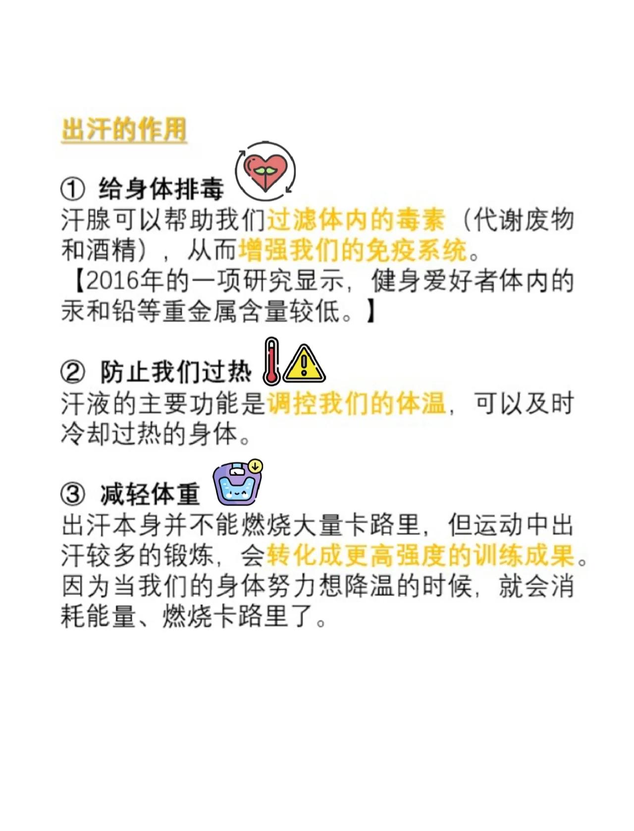 4、1运动 进行有氧运动,如跑步跳绳游泳打篮球等,这些运动能够加速新陈代谢,促进全身血液循环,从而帮助身体快速出汗高强度间歇训练HIIT这种训练方式能够在短时间内使心率急剧上升,增加身体产热和出汗量2汗蒸或桑拿 通过汗蒸或桑拿,利用高温环境使身体毛孔扩张,加快血液循环,促进身体。