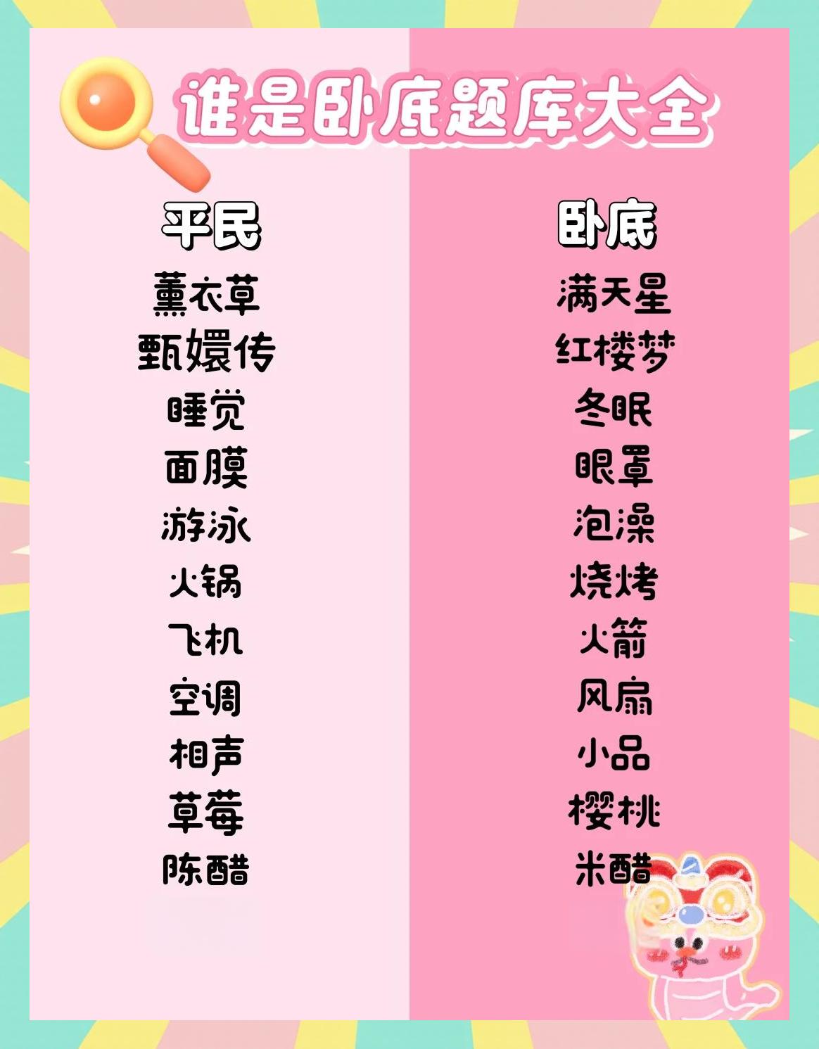 卧底游戏规则详解对于8人以下的团队,游戏规则如下场上有7名玩家拿到同一主题词语,而另一位玩家拿到与该主题相关的不同词语,被称为卧底 在每一轮中,每位玩家需要描述自己的词语,既要隐藏卧底的真实身份,又要向同伴传递微妙的线索 描述结束后,全体成员进行投票,票数最多的人将被。
