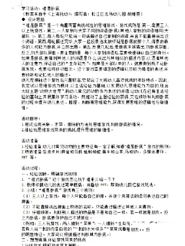 游戏规则1在场所有人中只有1人拿到与其它人手中的词语不同的词语,除此人以外,其他人则持有相同词语2每人每轮用一句话描述自己拿到的词语,词语禁止重复,话中不能出现所持词语,不能让卧底察觉,也要给同伴以暗示3每轮描述完毕,所有在场的人投票选出怀疑谁是卧底,得票最多的人出局若没有人的得票超过半数50%,则没有人。