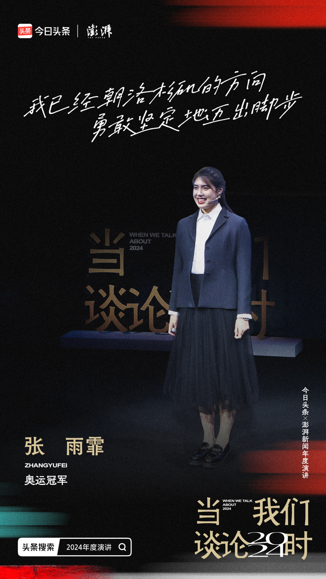 大家好,我是中国游泳运动员张雨霏。很多人认识我,应该都是从东京奥运会上那张藏在奖牌后面的照片“猜猜我是谁”,也有可能是因为在网络上某个我灿烂的笑容,更有可能是因为最近的很多时尚大片,很多人就会表扬我,“真公主呀,简直是公主一样的人生”,真的非常感谢大家的支持与喜爱。我也一直觉得过去的7年时间里,我的游泳生涯就像是童话一样。很长一段时间,我感觉自己付出六分、八分的努力,就可以获得十分、十二分的回报。遇到的每一任教练、每一个团队的小伙伴,都在拼尽全力地保护我,非常真诚地帮助我,给予我充分的信任和支持。所以东京奥运会上我获得了2金2银,福冈世锦赛拿到了人生的第一枚世锦赛金牌,杭州亚运会上拿到了6枚金牌,并且获得了杭州亚运会的MVP。今年巴黎奥运会虽然没有获得金牌,但是出战六项获得六项奖牌,我觉得也算是一个不错的战绩。我觉得自己的状态在奥运会前逐渐回升的时候,好像哪怕世界纪录也不在话下,所谓的童话也不过如此。直到2024年8月5日,巴黎奥运会女子4x100米混合泳接力决赛的一瞬间,我才发现我在这届奥运会一枚金牌也没有拿到,可是运动员来到奥运会上,不就是为了金牌,为了世界纪录去比赛的吗?那个瞬间猛得把我拽回了现实世界,是啊,这就是竞技体育,原来奥运赛场上才没有公主梦的剧本,没有绝对的优势,不确定性才是常态,这就是竞技体育的魅力。从小训练的经历告诉我,付出多少努力,身体一定会给我相应的回报,我还是比较相信这点的,因此也算是训练比较刻苦的。巴黎奥运会,教练和我早就制定了参赛六项的目标,我也对金牌和世界纪录一直抱有执念,我是一个比较好强的人,这一点其实不只体现在训练和比赛上,生活中多多少少也会渗透一点,所以身边的朋友和我在打赌开玩笑的时候,我总是暗暗地和他较劲。如果一直达不到目标,我就会变得很焦虑、很激进,我不接受失败。在走向巴黎的路上我付出了所有的努力,用尽了所有的方法,我身边有一个助理教练,他从2017年就跟着我,他说霏姐,我从来没有见到你如此努力训练的样子,这句话我听到都不知道是该笑还是该高兴。巴黎奥运会虽然获得了六枚奖牌,但我觉得也算是实现了我赛前制定的目标。看着手中的银牌和铜牌,我突然意识到好运气总是会有用完的一天,那些付出六分、八分的努力,就能获得十分、十二分的日子终于一去不复返了,这不是童话世界,而是一个真实而又残酷的世界,甚至不是所有的努力与付出都是有同等回报的,相信在座的各位都一定有体会。赛后我在社交媒体上写下:“致我遗憾又完美的巴黎奥运会。”虽然少一点金色,但一个运动员26岁的人生里,能拿到10枚奥运奖牌,又怎么能不算是残酷现实里的一种完美呢?我也感谢现实里给我的这点缺憾,正是因为没有达到我想要的“赢”,我承认了我的失败,我才能看到自己其实还有更多进步的空间,也才让我有欲望和勇气继续走下去。感谢游泳,原来她一直在带我前行。那些泳池教会我的事