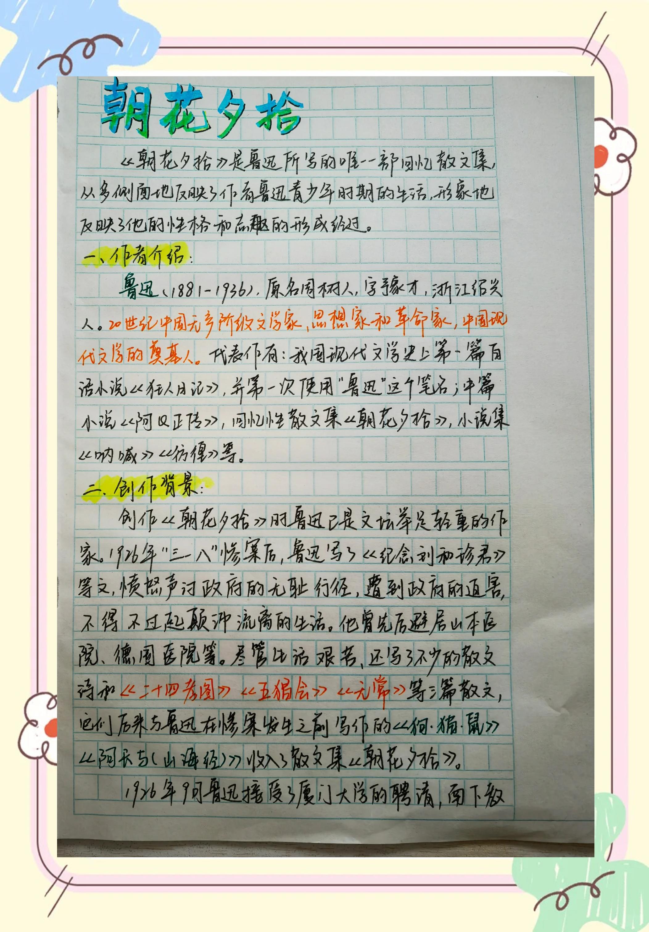 10、朝花夕拾是鲁迅先生所写的唯一一部回忆散文集,原名旧事重提,一向得到极高的评价作者说,这些文章都是“从记忆中抄出来”的“回忆文”本书为鲁迅一九二六年所作回忆散文的结集,共十篇前五篇写于北京,后五篇写于厦门以下是一篇朝花夕拾读书笔记朝花夕拾读后感朝花夕拾。