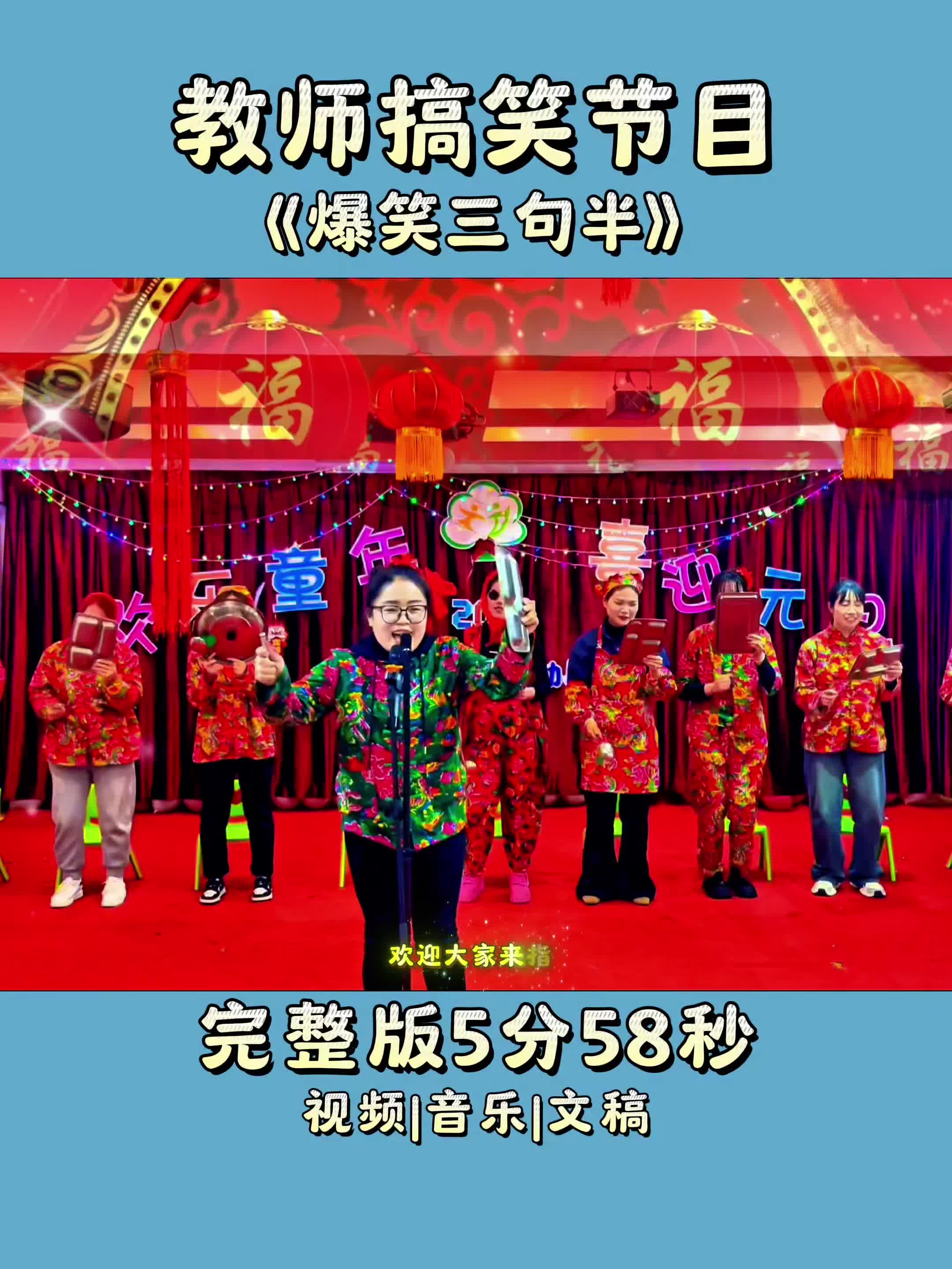 教我如何喊口号可我只学会了搞笑上帝终于发火了,为什么拿着我给你的东西总是胡闹总是搞笑又总是不学好我也终于发火了,谁让我还天生就是这块料,元旦表演三句半惹得大家哈哈笑欢欢喜喜大拜年,讲得不好请包涵精彩节目在后面,接着看那我们呢走喽鞠躬,退场。
