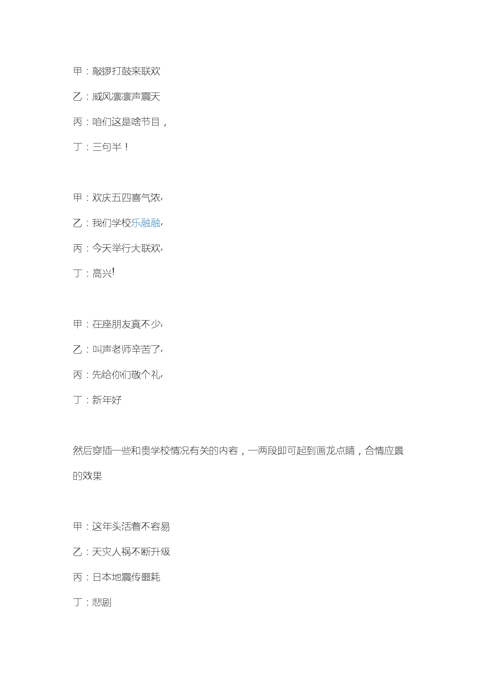 1我们四人走上台,欢庆锣鼓敲起来,咱们说点儿什么呢?咣拜拜前三人还没开演呢怎么就拜拜了 丁嘿嘿,重来2今儿就说个三句半,说得不好不吃饭,我们都是头一回,添乱3上台表演腿打颤,大事小事胡乱侃,如有雷同你别喊,谁敢4同事领导大家好,欢迎大家来指导,不管。