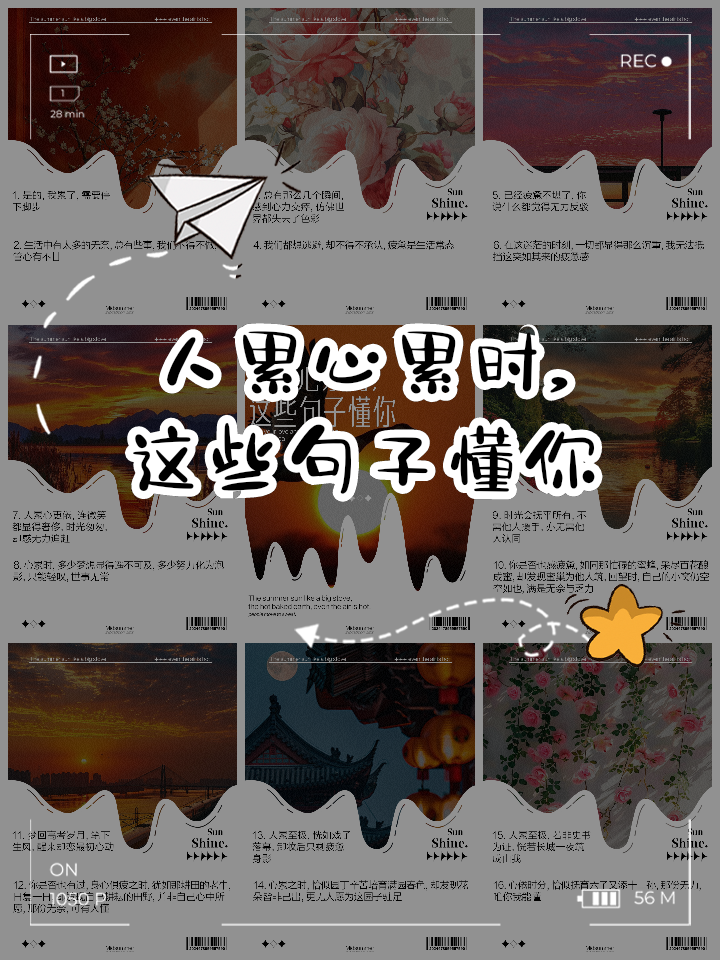 12现在心好累,好累,想哭却都没有了力气13我不在期待了,安静地等待,最后只剩空白14时间几乎会愈合所有伤,请给时间一点时间15最后和你在一起的人,往往是你想不到的人16等待一个没有结局的结局,我麻木了厌倦了17逃避只不过是一种借口,因为心里依然有伤18我真的。