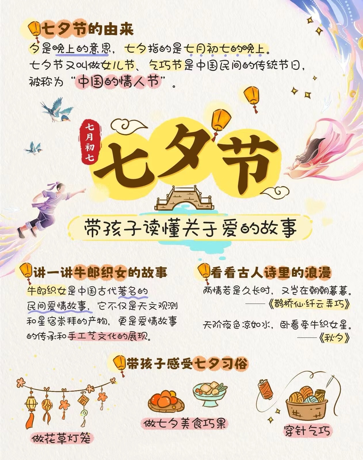 3、1 农历七月七日夜或七月六日夜,少女们身着新衣,围绕庭院,向织女星祈求智慧与巧艺,这被称为“乞巧”2 乞巧习俗中,女子们通过穿针引线来展示她们的巧手,制作小物品比试她们的技艺,同时摆放瓜果以示敬意3 不同地区有着各自独特的乞巧方式,每一种都蕴含着丰富的文化趣味;乞巧古诗的诗意主要是描绘了农历七月初七夜晚,女子们向织女乞取智巧的情景首先,诗的开篇“七夕今宵看碧霄,牵牛织女渡河桥”描绘了七夕之夜的美丽景象人们抬头仰望浩瀚的天空,期待着牛郎织女在鹊桥相会的浪漫时刻这里的“碧霄”指的是广阔无垠的青天,而“牵牛织女渡河桥”则是对牛郎织女传说的。