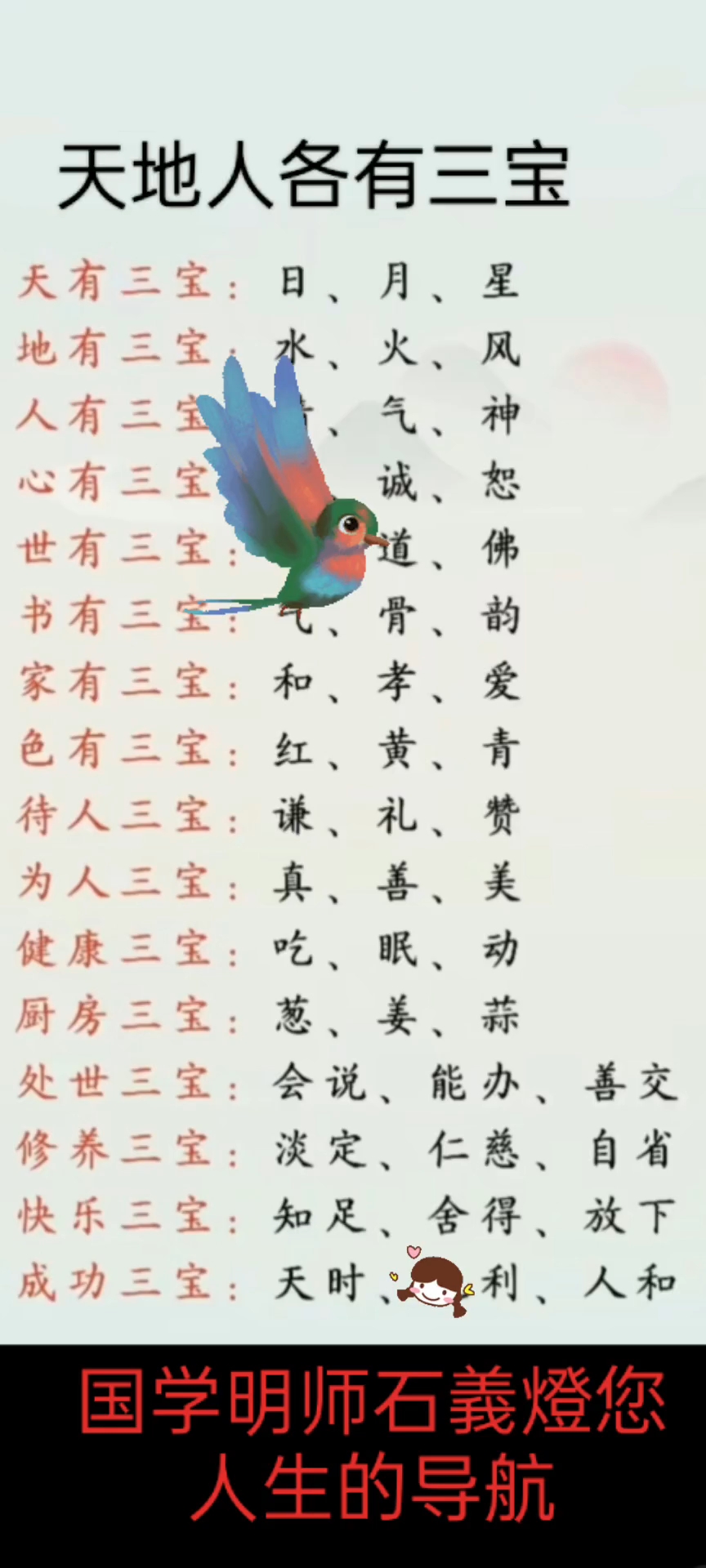三才者 天地人“三才”指的是天才地才人才,这里以天地人象征它体现了古代中国对人的重视,将人与天地并列,彰显了人本主义思想在儒家经典易经中,三才象征着天道地道和人道的平衡,强调人与自然的和谐共生三光者 日月星“三光”指的是日光月光星光,这里具体指日月星它们寓言了宇宙的秩序。