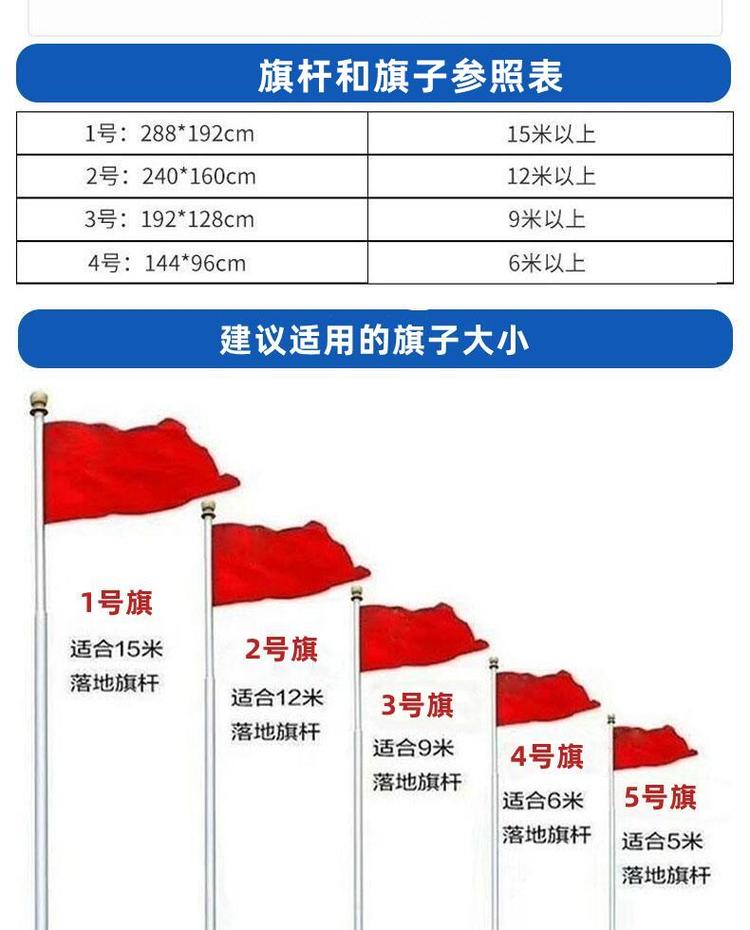 旗杆悬挂的国旗标准尺寸与旗杆高度对应,常见的五种规格已由国家统一规定日常使用中,国旗尺寸需根据旗杆高度匹配例如3米高的旗杆配1号国旗长288厘米×宽192厘米,12米旗杆则适用4号国旗长240厘米×宽160厘米广场学校等公共场合常用的15米旗杆,一般悬挂5号国旗长192厘米×宽128厘米。