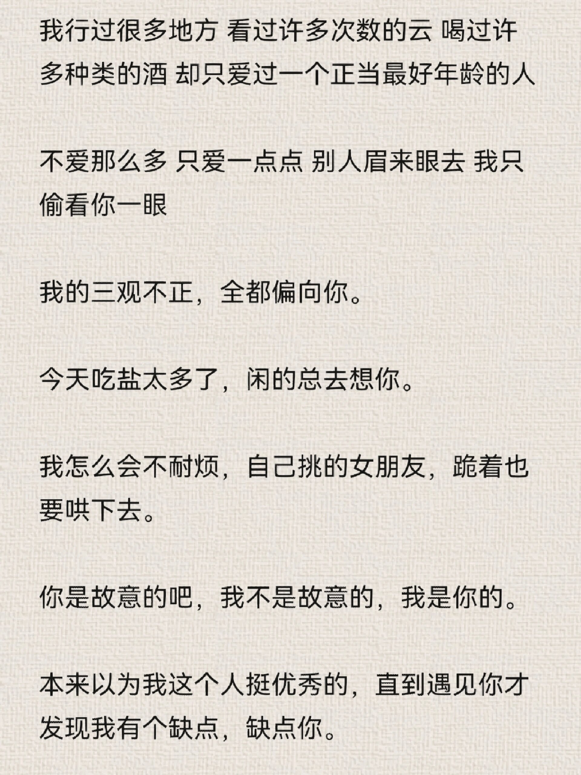 1想给你做饭,陪你睡觉2要是我能成为那个你最想见到的人就好了3我以前觉得我是自由的,起码这一生没有谁能降住我,遇见你以后,自由和野心我都不要了,我只要你4一眼万年的事我不渴望,一见钟情也不太属于我我只想,只想多见你一次,多和你说一句话5我明天有空,后天。