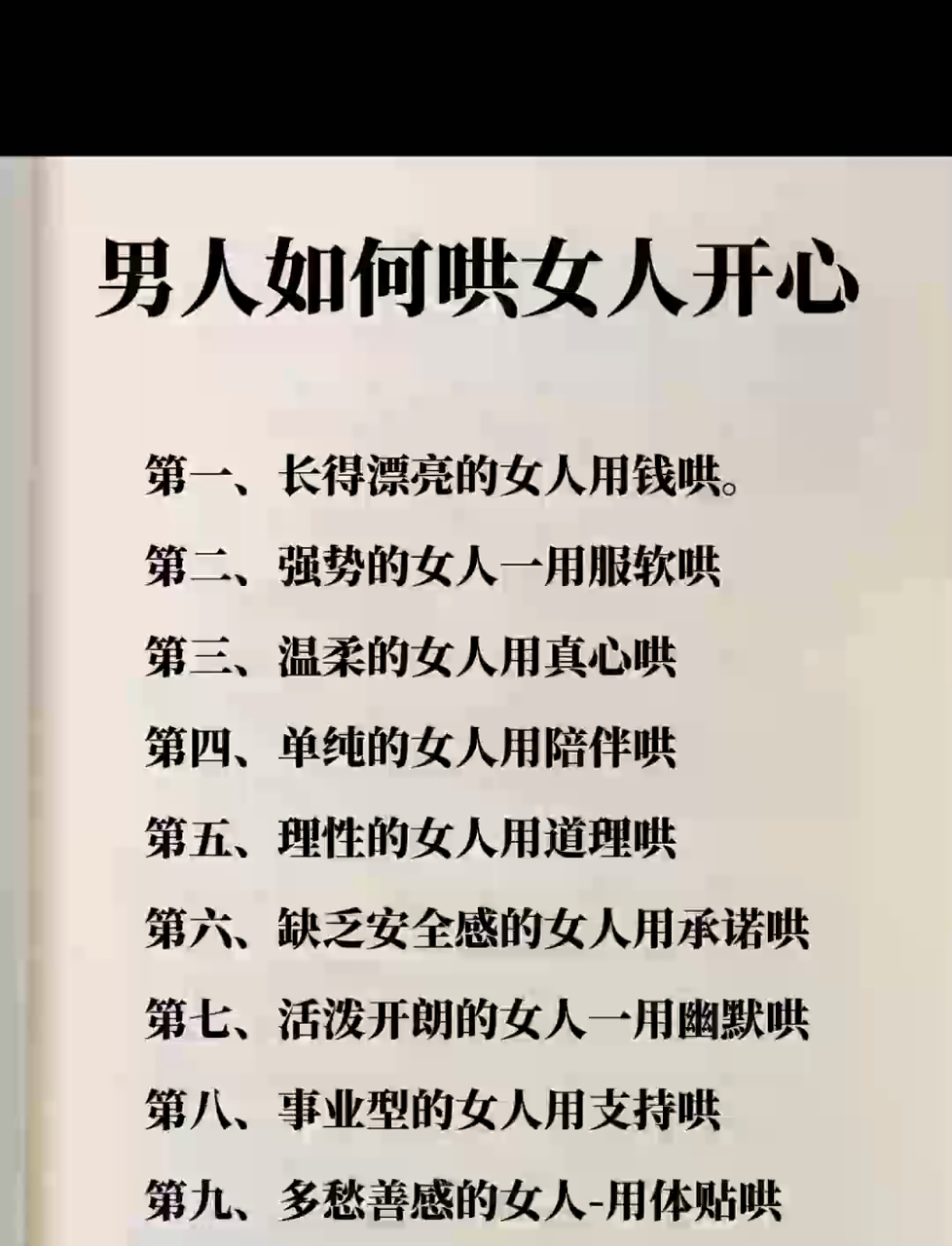 1、对女生而言,世界上最美的话就是伴侣说的情话了说情话也是最有效的哄人方式,是每一位男生交往中必学的技巧所以我整理了40句哄女孩子开心的话,还不会说甜言蜜语的男生一定要学习一下啦!哄女孩子的甜言蜜语 1 结婚前,你喝可乐我喝牛奶,我吃萝卜你吃白菜,你喜进商场,我乐意逛街结婚后;如果还是不小心把女朋友惹生气了,那就用上面的这几种方法哄她,一定要切记,千万不能冷战!不管她! 哄女人怎么哄比较有效3 女朋友生气了怎么哄? 男生在女朋友生气后,一般会问女孩为什么不开心,到底是哪里出了问题其实男生的想法是找到原因,然后去根据这个原因解决问题但是如果你往这个方向走,女孩会越来越生气;28 哄女友开心,需要耐心和关心29 用关心和陪伴来哄她30 直接拥抱她,表达你的爱意31 快速道歉,展现诚意32 送礼物,制造惊喜33 表达你的爱意和承诺34 真诚的道歉和表白35 了解她的喜好,制造惊喜36 坚持发信息问候,表达关心37 带她去吃美食,让她开心38;你要搞笑,要夸张的表现出你跪着乞讨的样子你的语气应该真诚温和你最好调皮一点,这样她看了会觉得你很真诚很搞笑这样你女朋友肯定会笑,会选择原谅你,然后会跟你抱怨你之前的所作所为这个时候你一定要用心听,听话浪漫的方法如果僵持不下,不妨买点礼物让她开心一下可以是一束花,一件;女孩子心情不好哄她开心的方法有暖心行动法,共情安慰法,转移注意力安慰法1暖心行动法 如果女生说心情不好,而你们又是异地的话,那你就对她说“等我一下,先给你点个外卖,待会你边吃边说,看看是谁惹我宝贝不开心了女生主动跟你说不开心,其实就是想要你的陪伴,如果没办法第一时间飞;4 营造浪漫氛围在特殊日子送花,或是用其他方式制造浪漫,可以让女人感受到你的用心浪漫不一定要花费巨资,而是要营造一种温馨和情调5 多关心体贴女人需要感受到男人的关心和爱护如果你表现出对她的关心,她会感到温暖和感动,更愿意与你在一起通过这些技巧,你可以更好地哄女人开心。