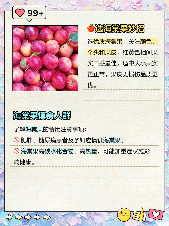 2、一凉性体质与特殊人群的食用禁忌1 脾胃虚寒者慎食相关资料指出,海棠果性凉,脾胃功能较弱或体质虚寒者过量食用可能刺激肠道,导致腹泻腹痛等症状尤其在秋冬季节,生冷食物摄入本就需节制,此类人群更应减少食用频率2 经期女性需忌口其凉性特质可能影响经血运行,引发痛经或经血不畅,建议。