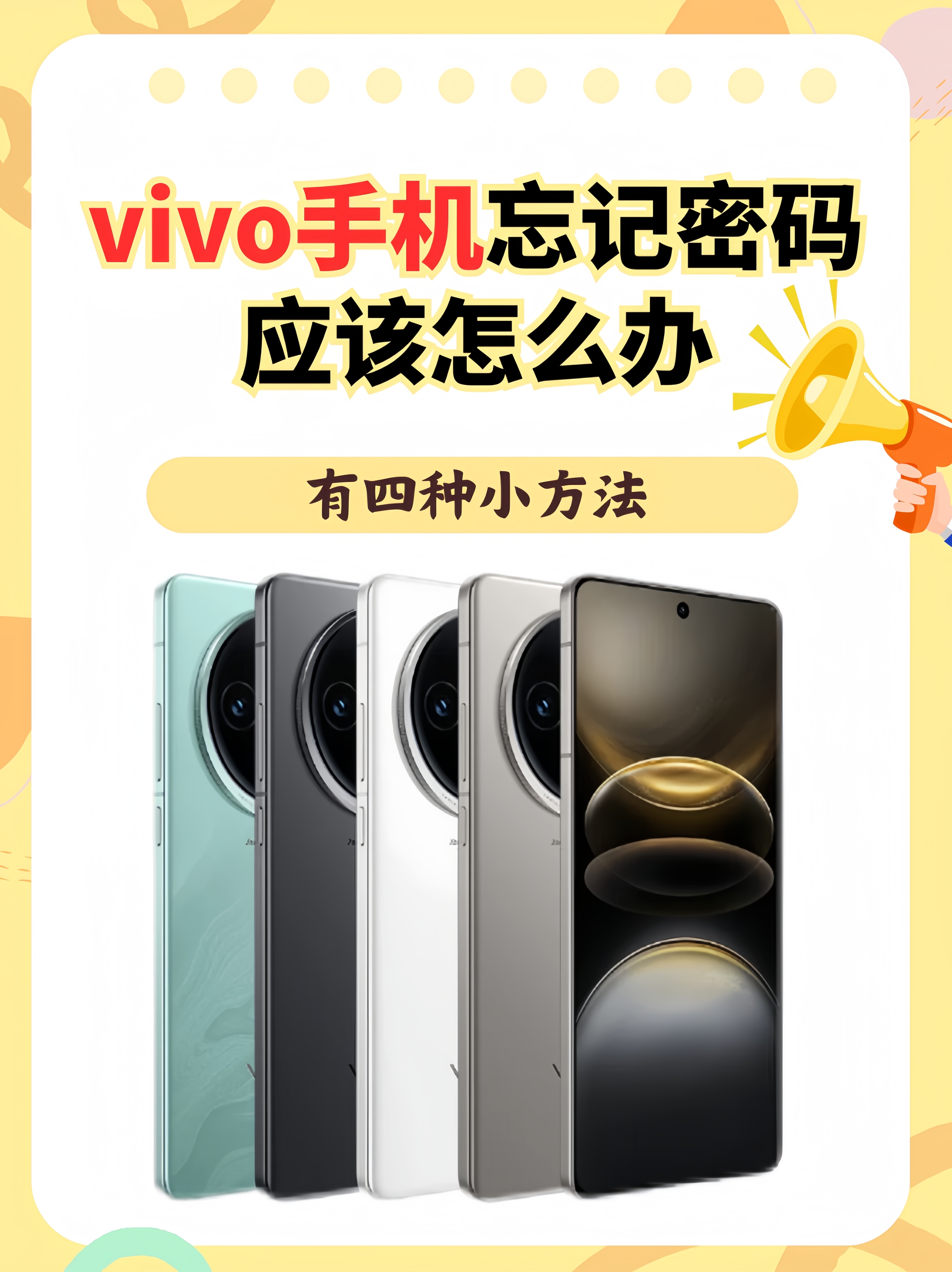vivo账户密码 进入手机设置帐号与同步点击vivo帐号帐号安全找回密码选择找回密码的方式进行操作桌面隐藏图标密码 有时为了避免个人隐私被他人看到,小伙伴们会选择“隐藏桌面图标功能”在桌面按MENU键vivo手机锁屏密码 连续输错5次锁屏密码,根据手机提示选择忘记密码图案输入设置的锁屏密码密保问题答案,然后就可以解锁手机屏幕了。
