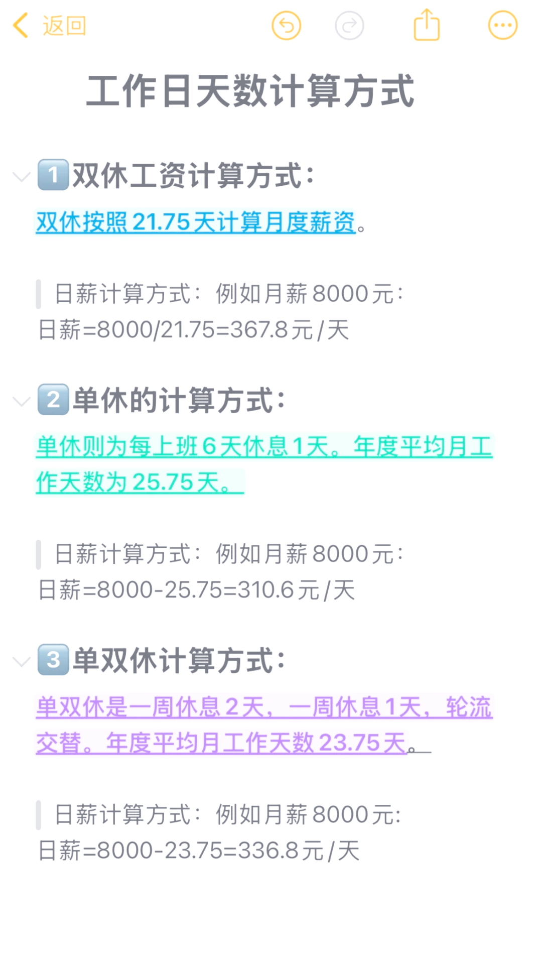 双休工作制月平均计薪天数为2175天基于五天工作制计算得出日工资 = 月薪 ÷ 2175大小周工作制月平均计薪天数约为24天基于大小周工作制的特点,即每月有两周工作6天,两周工作5天,平均得出日工资 = 月薪 ÷ 24单休工作制即每周工作6天月平均计薪天数约为26天日。