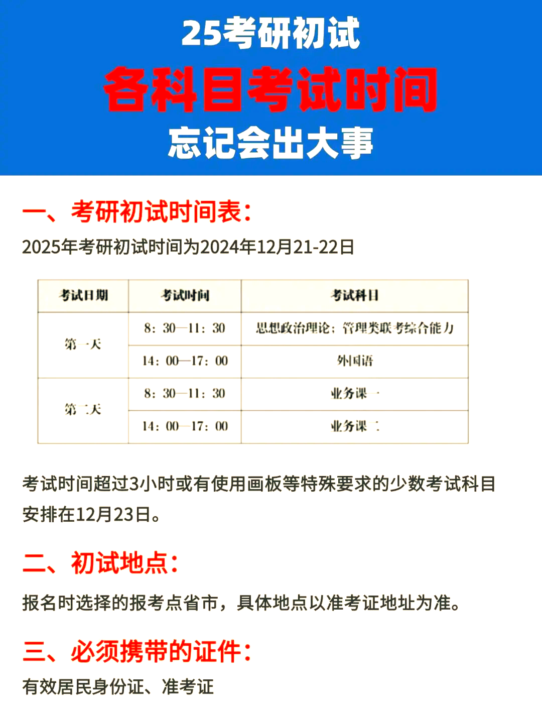 2025年考研科目安排时间表如下初试时间考试日期为12月23日周六12月24日周日第一天12月23日上午830 1130考思想政治理论,时长3小时下午1400 1700考外国语,时长3小时,包括英语一二日语等第二天12月24日上午830 1130考数学或专业基础课,时。