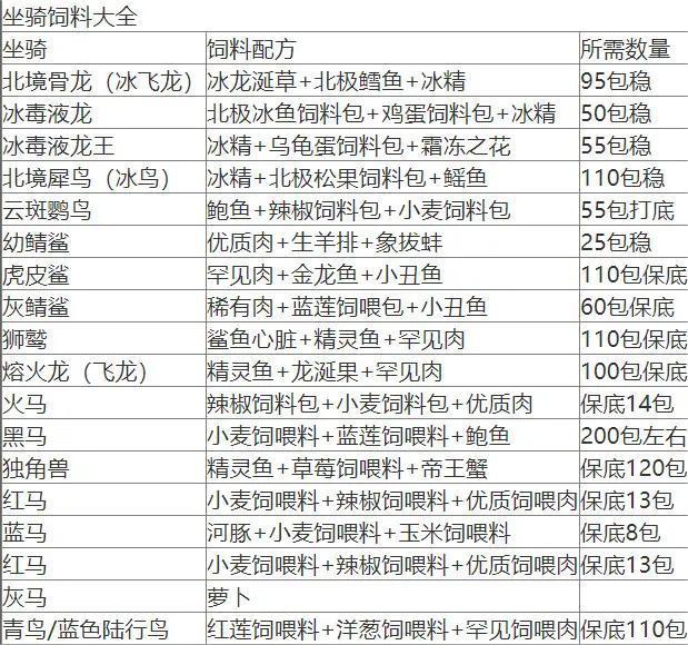 创造与魔法饲料大全主要包括以下几类一坐骑类饲料 云斑鹦鸟鲍鱼+辣椒饲料包+小麦饲料包,55包打底幼鲭鲨优质肉+生羊排+象拔蚌,25包稳虎皮鲨罕见肉+金龙鱼+小丑鱼,110包保底灰鲭鲨稀有肉+蓝莲饲喂包+小丑鱼,60包保底狮鹫鲨鱼心脏+精灵鱼+罕见肉,110包保底飞龙。