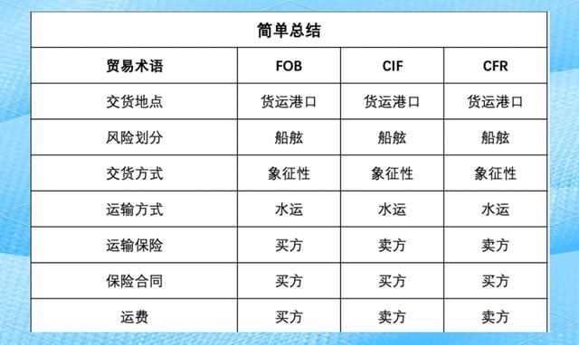 4、FOB和CIF最核心的区别在于费用承担方和风险转移节点前者买方负责运费保险费,后者由卖方承担货物风险在FOB下装船即转移,CIF则到目的港后才转移1 责任划分差异 在FOB装运港船上交货中,卖方只需将货送到装运港并装上船,之后的运费保险均由买方安排和支付而CIF成本+保险+运费;答案FOBCNF和CIF是外贸中常见的贸易术语,它们分别代表不同的贸易条件和价格结构具体区别如下FOB离岸价指货物在装运港离船越过船舷时的价格这意味着卖方只负责将货物装载到买方指定的船上,并负责承担装运前的所有费用和风险买方则需负责货物从船舷到目的地的所有费用和风险这种贸易方式有;CIF与FOB的主要区别在于保费和运费的承担方以及风险转移的具体时点1 保费和运费的承担方CIFCost, Insurance, and Freight在CIF贸易术语下,卖方需要承担将货物运至指定目的港所需的运费,并为货物购买保险以覆盖运输途中的风险这意味着,从装运港到目的港的过程中,运费和保险费都由卖方。
