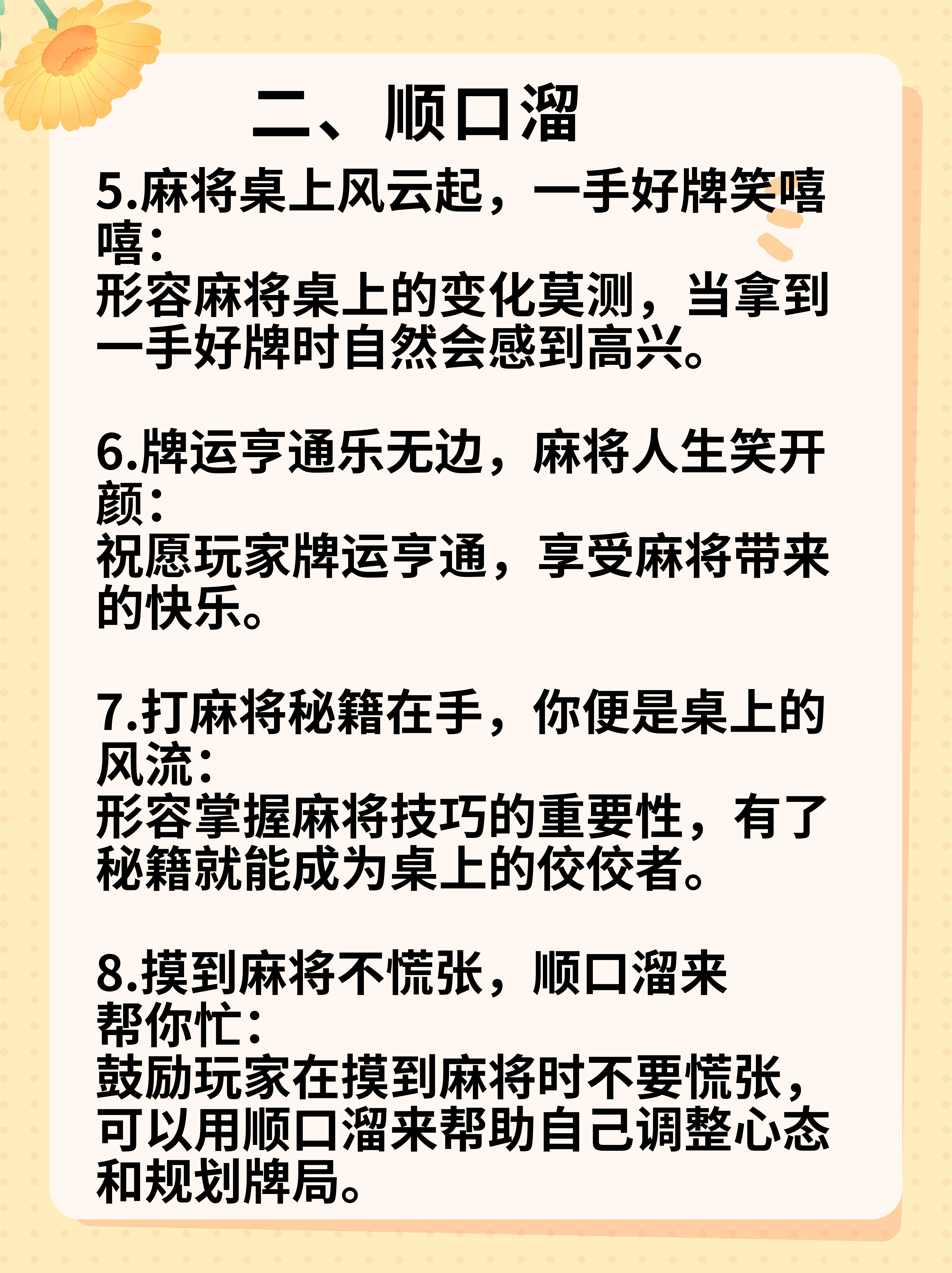 打麻将的技巧口诀表确实包含了一些实用的策略,以下是对这些技巧口诀的详细解释打断连的生张,留熟张或绝张当牌局中某些连续的牌已基本打完时,应优先打掉那些剩余的生张,而留下场中已有的熟张,甚至是绝张这是因为熟张和绝张更容易与其他牌组合成搭子打多张的将连张,留中心张如果手中。