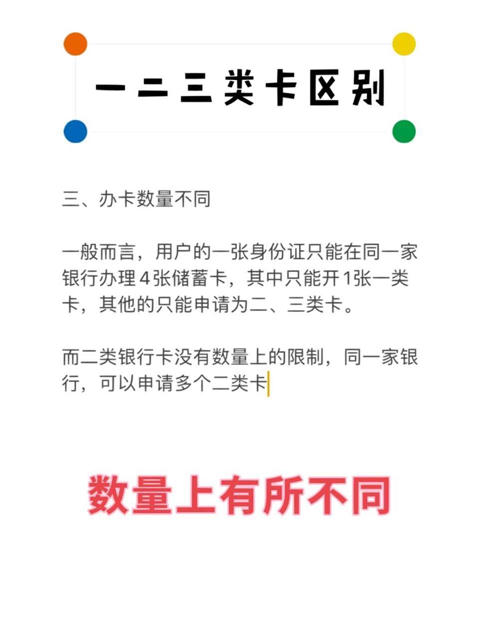 银行卡一类卡与二类卡的主要区别如下功能限制一类卡也叫全功能银行卡,不受任何限制,可以进行大额转账交易,适合作为工资卡使用必须有实体卡二类卡相当于钱包,功能受限,适用于日常消费网购和网上支付不需要必须办理实体银行卡,可以仅作为虚拟账户存在持有数量一类卡一个自然人在一家银行只能办理一个一类。