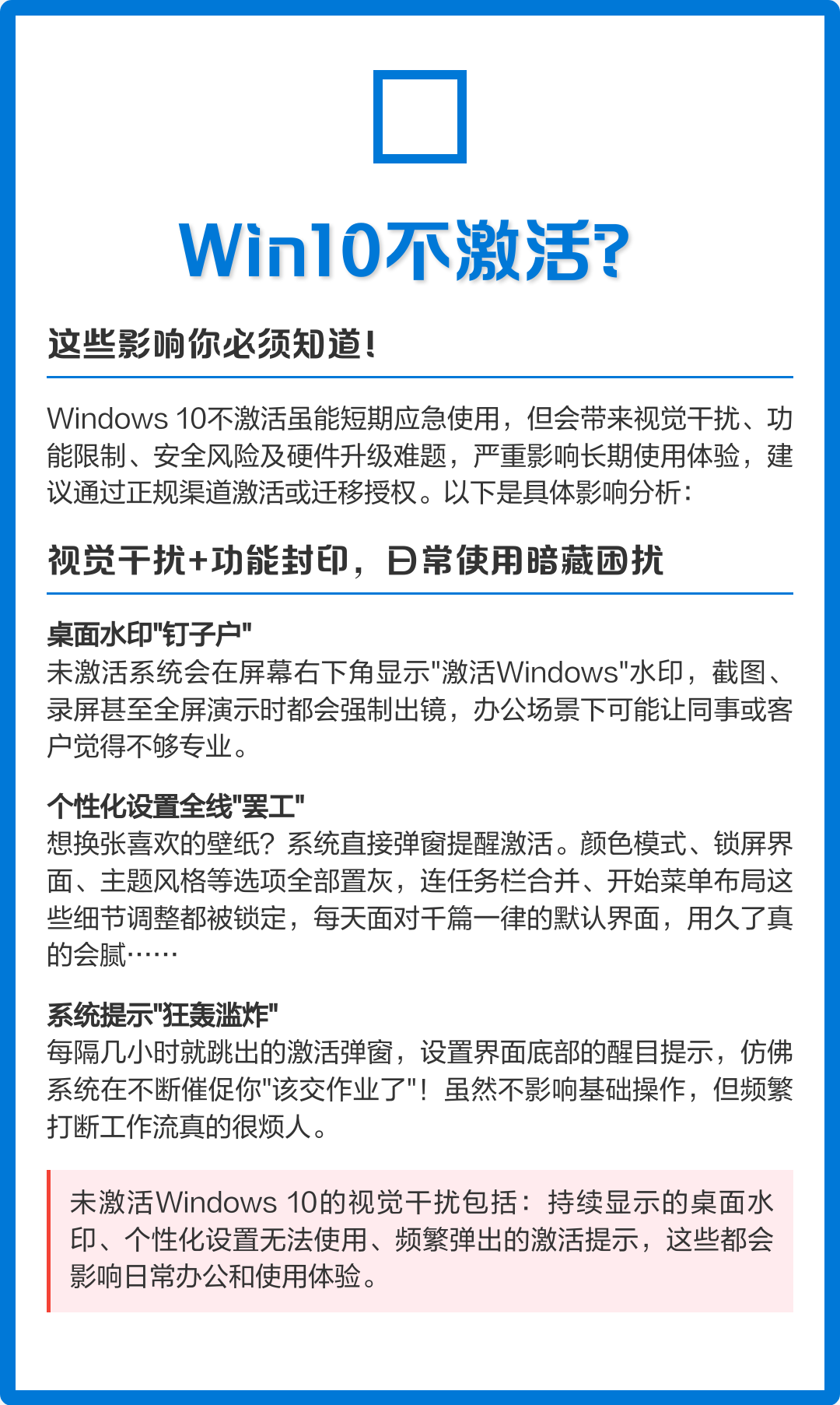 5、不激活Windows 10会带来以下后果个性化设置受限无法使用个性化功能Windows 10未激活时,用户将无法访问和修改大部分个性化设置,如桌面背景颜色方案锁屏界面和主题等这些设置项将呈现灰色,无法点击和修改系统水印提示桌面右下角出现水印在未激活的Windows 10系统中,桌面右下角将持续显示“。