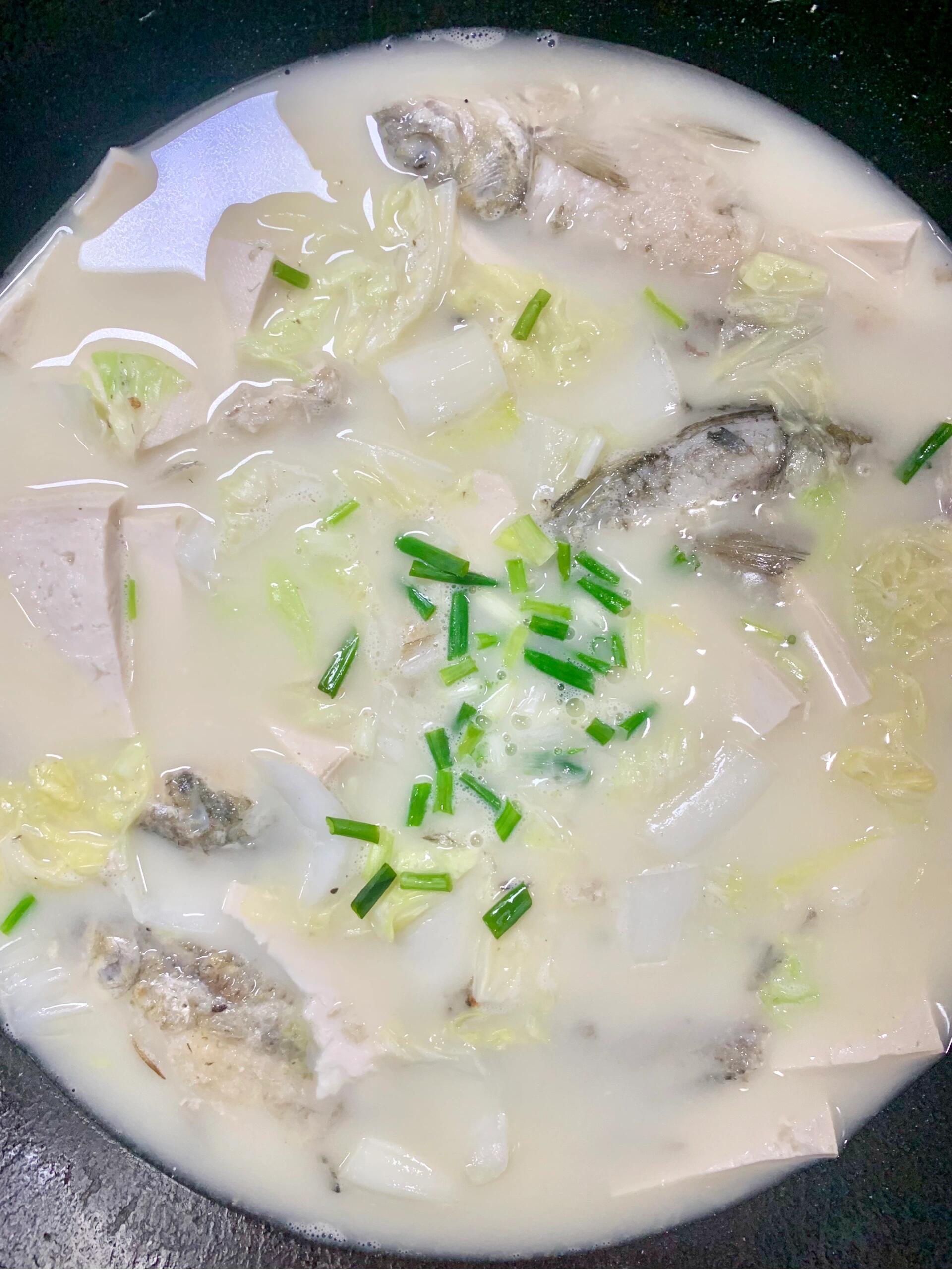鱼汤变白时加入豆腐,小火炖到汤汁浓稠即可鲫鱼豆腐汤的做法准备用料鲫鱼2条豆腐200克油适量盐2克料酒15克葱1段姜3片 1鲫鱼收拾干净,撒上少许料酒2豆腐切块备用3葱姜切片备用4热锅热油,要小火慢煎,煎至鱼两面金黄5然后倒入适量水,加料酒葱姜6。