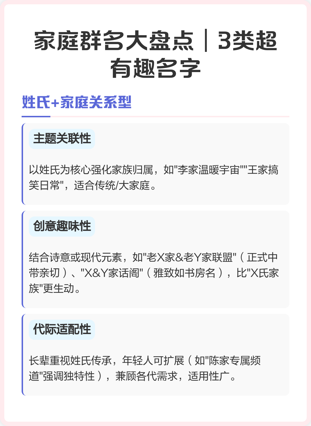 欢乐搞怪风以幽默诙谐为特点,适合活跃气氛的家族群推荐名称如“皇亲国戚交流群”“干饭家族委员会”通过夸张身份或日常行为制造笑点“三朵奇葩欢乐多”“全球亲人互捧群”则以自嘲或夸张互动增强趣味性“欢乐饭米粒family”结合中英文谐音,增加记忆点文艺诗意风此类名字融入自然意象或文学修辞。