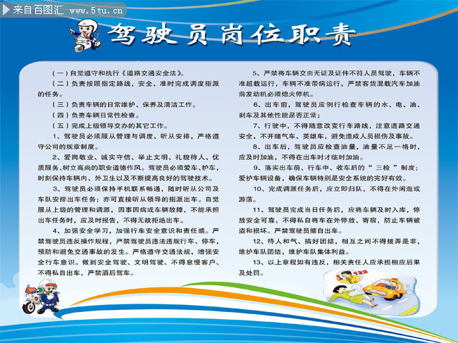 14、司机岗位职责要求,司机是指具备驾驶车辆的专业知识和经验并依法取得驾照,从事车辆驾驶职业的人员岗位职责是一个具象化的工作描述,可将其归类于不同职位类型范畴那么司机岗位职责要求是什么呢? 司机岗位职责要求1 司机岗位职责 一驾驶员上岗工作时间,即包括正常上班时间,也包括加班时间和节假日出车及领导安排的其它。
