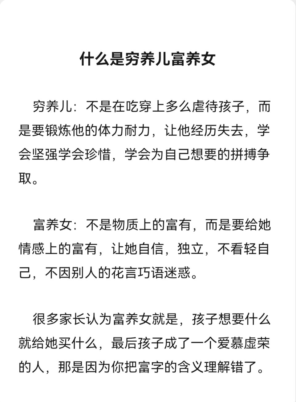 同时,家长也应该注意,无论是穷养还是富养,都不能忽视对孩子的关爱和陪伴只有在充满爱的环境中成长的孩子,才能成为健康快乐有责任感的人总之,“穷养儿,富养女”的真正含义在于通过不同的教育方式,培养男孩和女孩各自独特的品质和能力,使他们成为更加优秀自信独立的人。