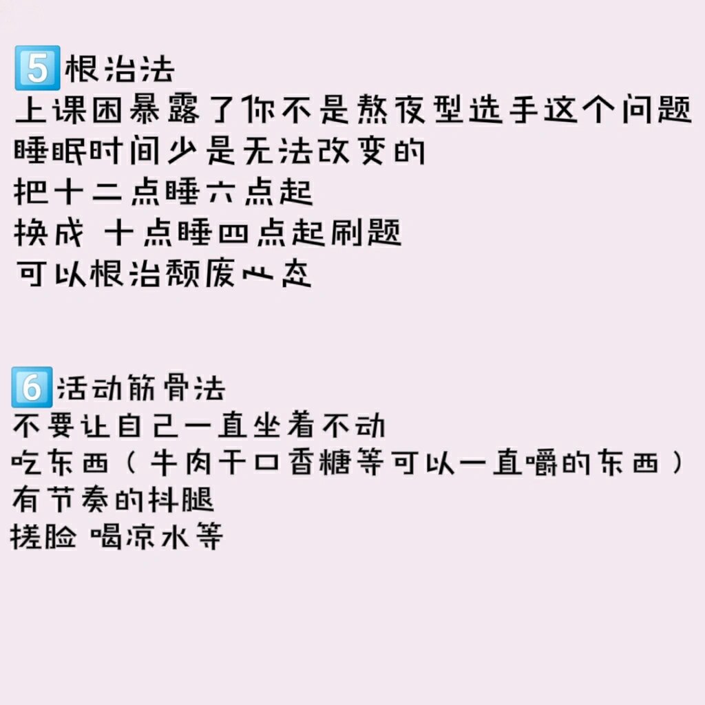 6、防止上课犯困的小妙招,保证让你立刻清醒的方法如下1 寻求同桌的帮助 在你感到困意袭来时,可以提醒你的同桌在你打瞌睡时轻轻掐你一下这种方法直接且有效,能在瞬间打断你的困意,让你迅速清醒同桌的轻微刺激可以作为一种即时的警觉信号,帮助你重新集中注意力2 使用风油精 准备一瓶风油精。