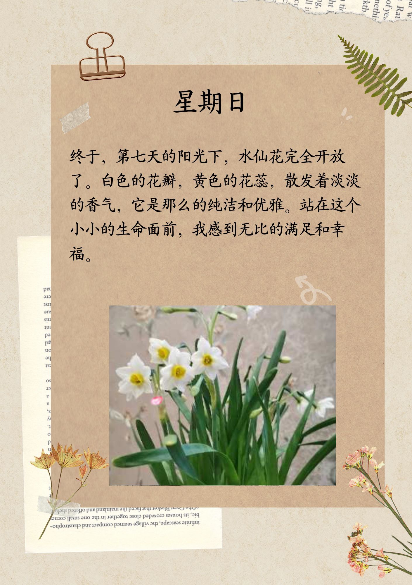 4、水仙花通常在晚间7至8点钟开放春季,尤其是1月至3月,是水仙花绽放的季节水仙球的形状类似大蒜,在宋代,人们将其称为“天葱”水仙花偏好温和的气候,尤其是在7月至8月,水仙花进入休眠期,此时应减少浇水量和施肥频率充足的阳光对水仙花生长至关重要,可以促使叶片更加翠绿,花朵更加明亮水仙花。