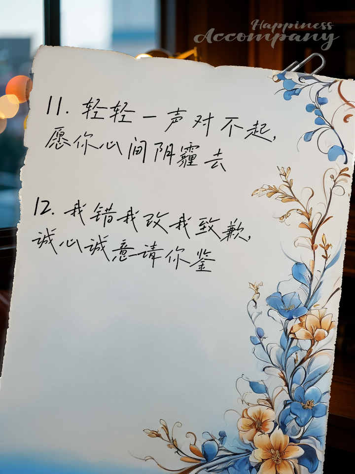 4、一暖心认错话语 1 因为你,我心中的小鹿一直在跳跃2 你是我最大的秘密,也是我最宝贵的底牌3 夜色正浓,海棠花开得如此绚烂,而你此时不在我身边4 世间万物都有自己的轨迹,而我的方向始终指向你5 爱上你之后,万物都变得可爱,世界也因此充满了浪漫6 我认真思考了一下,不。