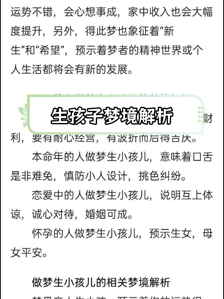 3、6 离婚的女人梦见抱小孩,也可能预示着她将遇到合适的男性并重新开始家庭生活7 准备参加考试的女人梦见抱小孩,可能是对未能充分准备而可能面临的不好结果的反映,希望下次能够取得更好的成绩以上分析应结合个人实际情况,仅作为参考。