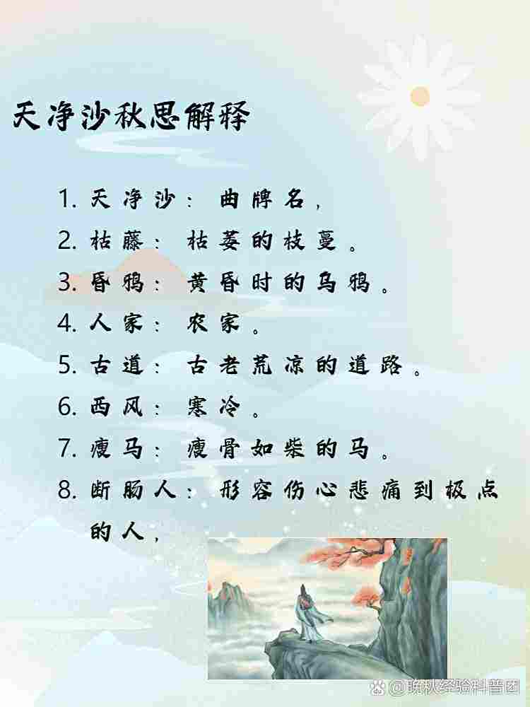 7、二翻译 天色黄昏,一群乌鸦落在枯藤缠绕的老树上,发出凄厉的哀鸣小桥下流水哗哗作响,小桥边庄户人家炊烟袅袅古道上一匹瘦马,顶着西风艰难地前行夕阳渐渐地失去了光泽,从西边落下凄寒的夜色里,只有孤独的旅人漂泊在遥远的地方三出处 元·马致远天净沙·秋思四赏析 这首小令很短。