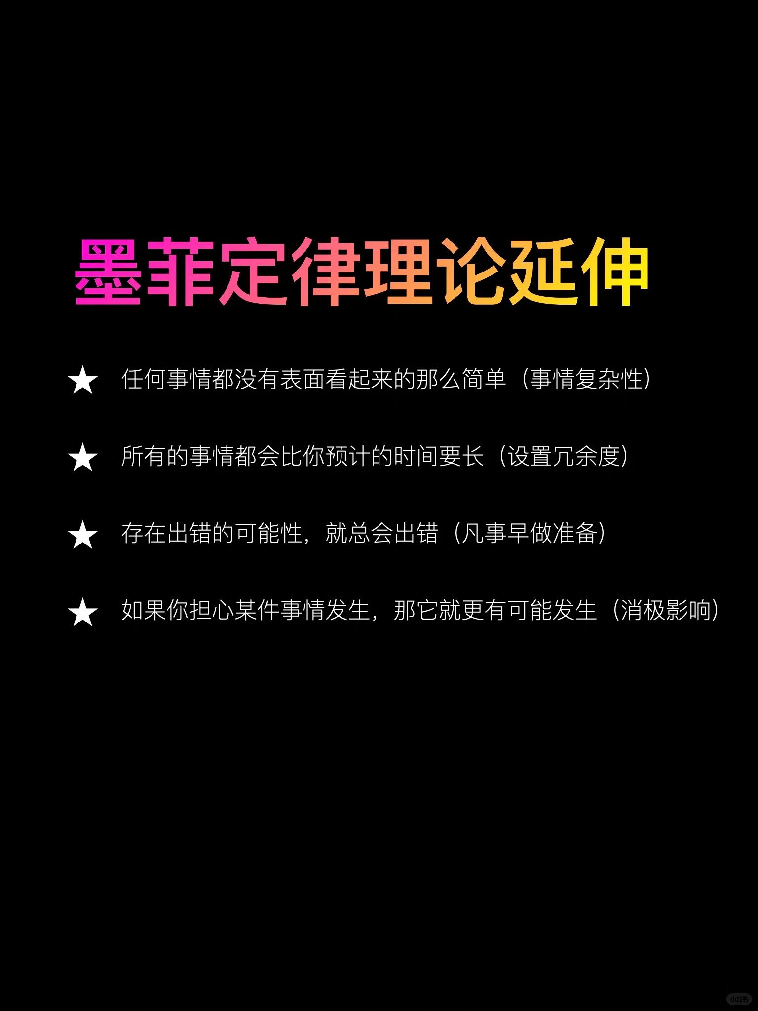 7、害怕什么来什么的定律是墨菲定律这个定律的主要内容有以下四个方面任何事都没有表面看起来那么简单这意味着在处理任何事情时,都需要更加深入和细致地考虑,不能只看表面现象所有的事都会比你预计的时间长这提醒我们在做计划时,需要预留足够的时间缓冲,以应对可能出现的意外情况会出错的事。