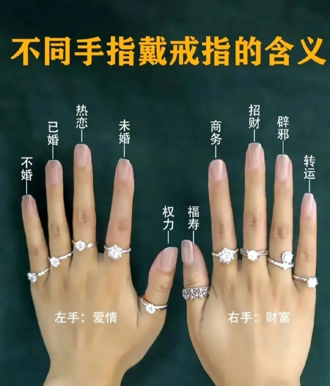 3、我认为不同手指戴戒指的含义如下1大拇指左右手大拇指都是代表着权势自信的意思2食指左手食指代表的是未婚,右手食指代表的是单身贵族3中指左手中指代表的是自己已经订婚了,右手中指代表的是自己已经名花有主,正在热恋之中,不希望有人打扰4无名指左手无名指代表的是自己已婚,右手无名指代表的;男士戒指佩戴在右手中指的含义因文化习俗和个人习惯有所不同,主要与婚姻状态情感表达或装饰需求相关一婚姻相关的常见含义1 订婚象征在部分地区和文化中,男士右手中指佩戴戒指常表示处于订婚状态,代表已有婚约在身,是对伴侣的承诺与宣告2 已婚状态也有一些情况下,男士会将婚戒佩戴在;3中指 左手中指和右手中指戴戒指大多表示自己已经名花有主求婚戒指和订婚戒指一般都戴在中指或者无名指 4无名指 左手无名指和右手无名指戴戒指代表已婚或正处于热恋中,情感生活很甜蜜,无论国内国外,结婚人士都会将戒指戴在无名指上,如果看到心仪对象无名指戴了戒指,那就要克制自己的感情,不要搞破坏哦 5小拇指 左手小拇指和右手小拇指戴戒指表示单身,并且;结婚戒指一般戴在左手的无名指上 情侣戒指可以戴在左手的中指或无名指上,也可以戴在右手的中指或无名指上 个人装饰戒指可以戴在任何手指上,没有特定的规定 男士戒指戴在不同手指的含义 左手中指代表着订婚或热恋中的状态 左手无名指代表着已婚 右手中指代表着个人魅力或事业成功 右手无名指;二戴右手各手指含义如下 1食指,向异性表示自己单身的身份,等待爱情到来 2中指,表示已经名花有主了 3无名指,表示已经有对象了 4小拇指,表示不想结婚,想再玩几年 三戒指的含义 戒指在古代多称为“指环”,而“戒指”之名的出现,则是元代的事情戒指传至民间,其作用就不仅是简单的装饰;以前的皇帝不用做事,都把戒指戴在拇指,象征着福寿安康荣禄绵长,适合年长者,尤其是男性 食指左手表示目前是单身,渴望恋爱右手防水逆,女士戒指戴在右手无名指,也表示是单身 中指左手表示名花有主,已经订婚右手中国有的地方流行男左女右,女手右手戴戒指表示女生名花有主,或者已经在恋爱中,都是表示。