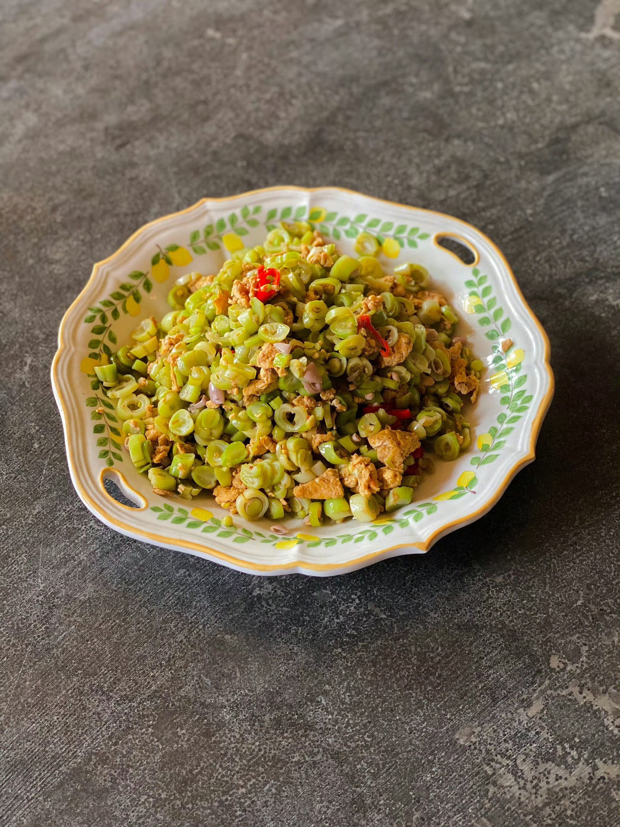 制作步骤 1 芸豆洗净掐去头尾,猪五花肉剁成肉糜,葱切葱花,姜切丝,干辣椒洗净切段,麻椒备用 2 将芸豆焯水23分钟,捞出晾干水分 3 锅中热油,将芸豆中小火翻炒至表皮皱褶微焦后盛出 4 留底油炒肉末至干香,再加入葱姜干辣椒和麻椒爆香,最后加入芸豆盐和鸡精,大火。