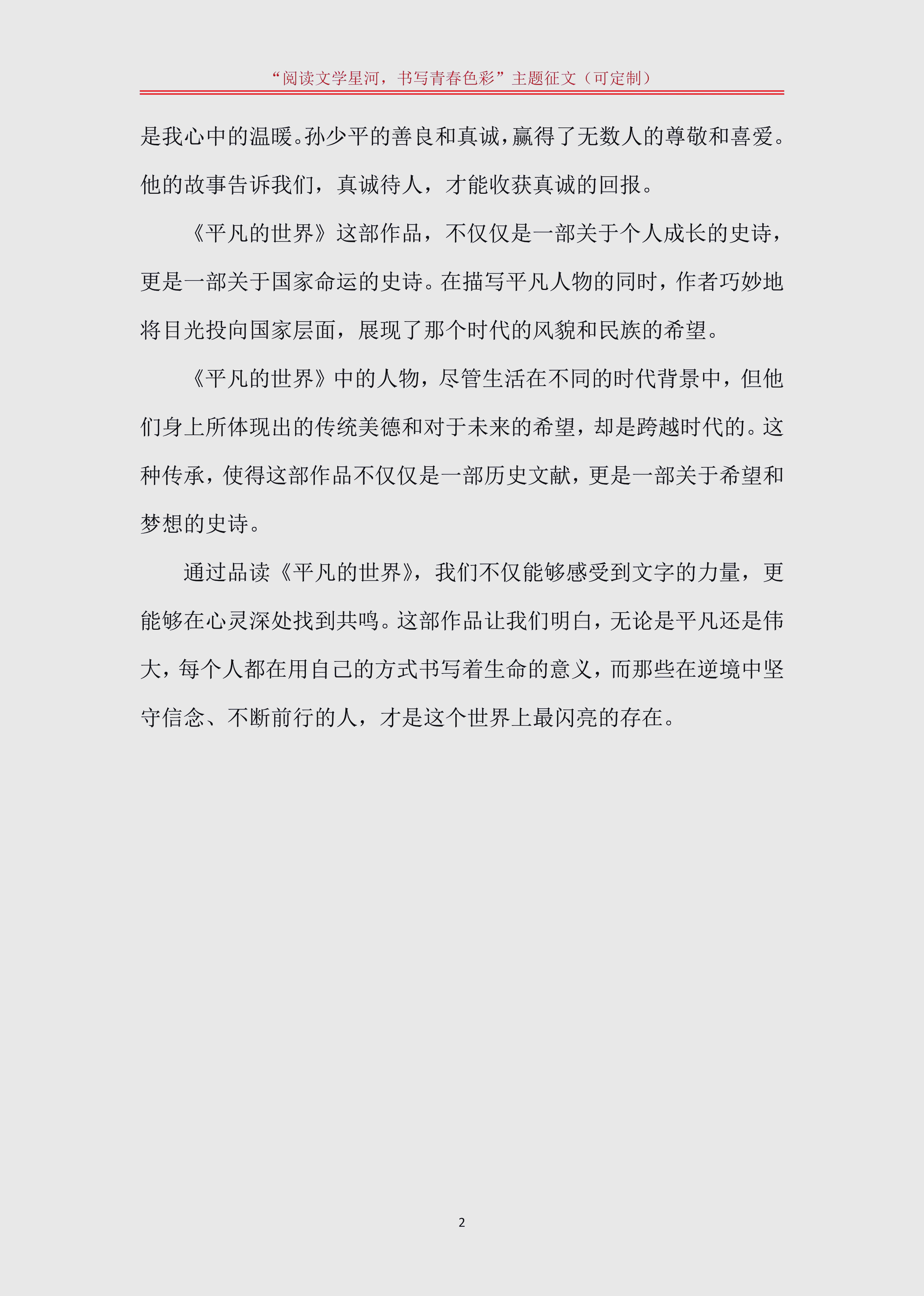2、平凡的世界读后感 一内容概述 平凡的世界以孙少安和孙少平两兄弟为中心,细腻地描绘了他们在平凡世界中的不平凡经历这本书通过讲述一个普通农村家庭的奋斗历程,展现了社会变革时期普通人的生活状态和情感纠葛书中充满了对亲情友情爱情的深刻描写,以及对苦难与奋斗的独到见解二知识。