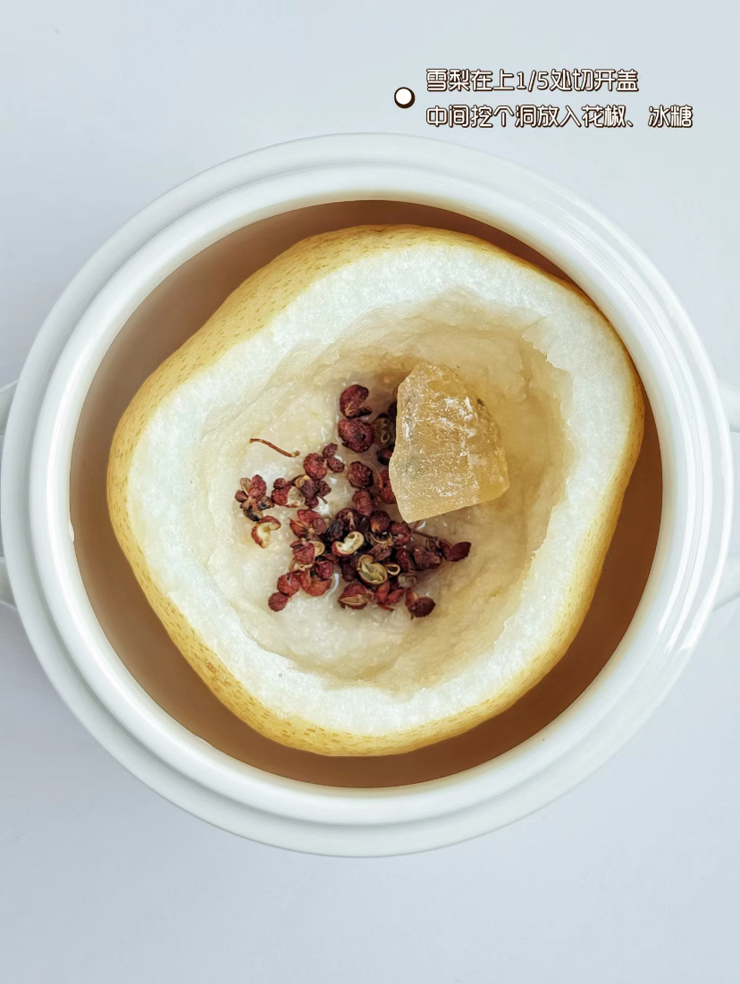花椒蒸梨的制作方法如下花椒蒸梨的制作步骤准备材料梨一个 花椒10粒 冰糖2块 处理梨将梨洗净去皮在梨的三分之一处切开,去核放入调料将花椒和冰糖放入处理好的梨中炖煮准备在炖盅内放入适量清水,大约在炖盅三分之二的位置,避免水过多溢出将装有花椒和冰糖的梨放入炖盅中。