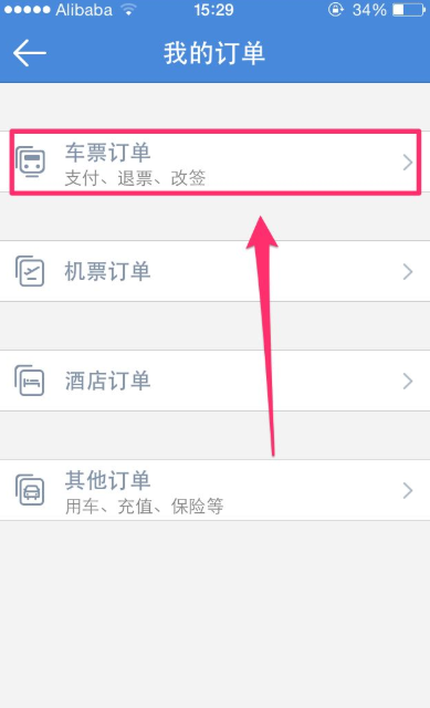 1、”页面中点击“火车票订单”,快速进入订单查询界面,轻松查询历史订单。