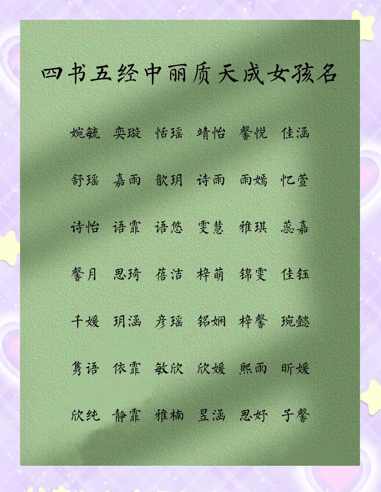 杨梓涵梓是一种树木,涵意为包容,整个名字寓意着女孩像梓树一样茁壮成长,有着包容的心 杨柳柳在诗经中有着美好的象征,代表着优美的身姿和动人的情怀 杨子韵子代表着尊贵和智慧,韵则象征着和谐与节奏,整个名字充满了音乐和诗意 杨诗琪诗代表着文艺和才华,琪则是美玉的意思,寓意着女孩既有才华又有美貌 杨秀琳秀意味着美丽和优秀,琳是美玉的一种。