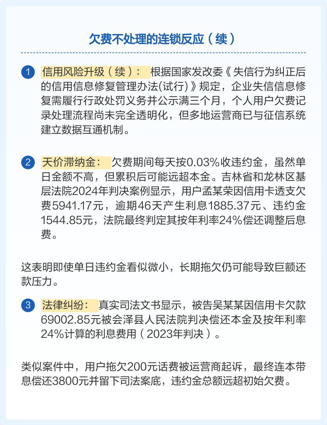 15、在使用身份证实名制办理的任何手机卡即使弃之不用,依然会与使用者及运营商保持未结清账单关系,未注销状态下仍会持续扣费若产生欠费且长期不缴纳,运营商可能会在该卡有效期结束后将其注销并转售他人未结清欠款且未注销的情况下,运营商可能会将绑定该手机号的身份证号列入黑名单,并在诚信系统中。