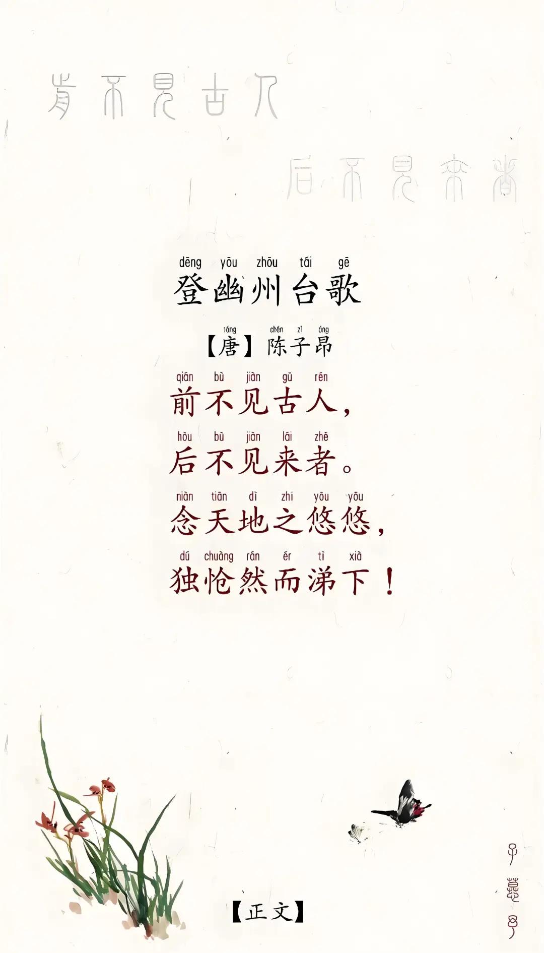 像燕昭王那样前代的贤君既不复可见,后来的贤明之主也来不及见到,自己真是生不逢时当登台远眺时,只见茫茫宇宙,天长地久,不禁感到孤单寂寞,悲从中来,怆然流泪了登幽州台歌唐代 陈子昂 原文前不见古人,后不见来者念天地之悠悠,独怆然而涕下译文向前看不见古之贤君,向后望不见当今明主。