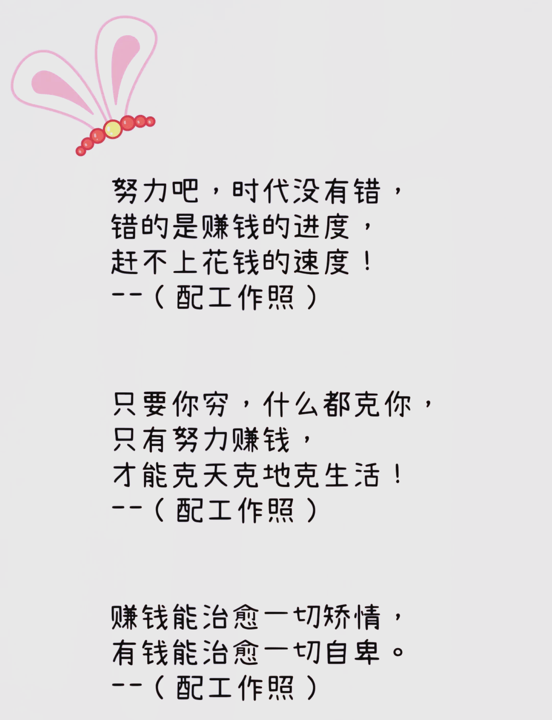 17、3今天搬砖不狠,明天地位不稳4打工不仅能致富,还能交友娶媳妇5人人都笑打工人,人人都是打工人6没有梦想的人,只能为别人的梦想打工7可能是上辈子作恶多端,所以这辈子要早起上班8打工可能会少活十年,不打工你一天也活不下去9今天工作不努力,明天努力找工作10爱情。