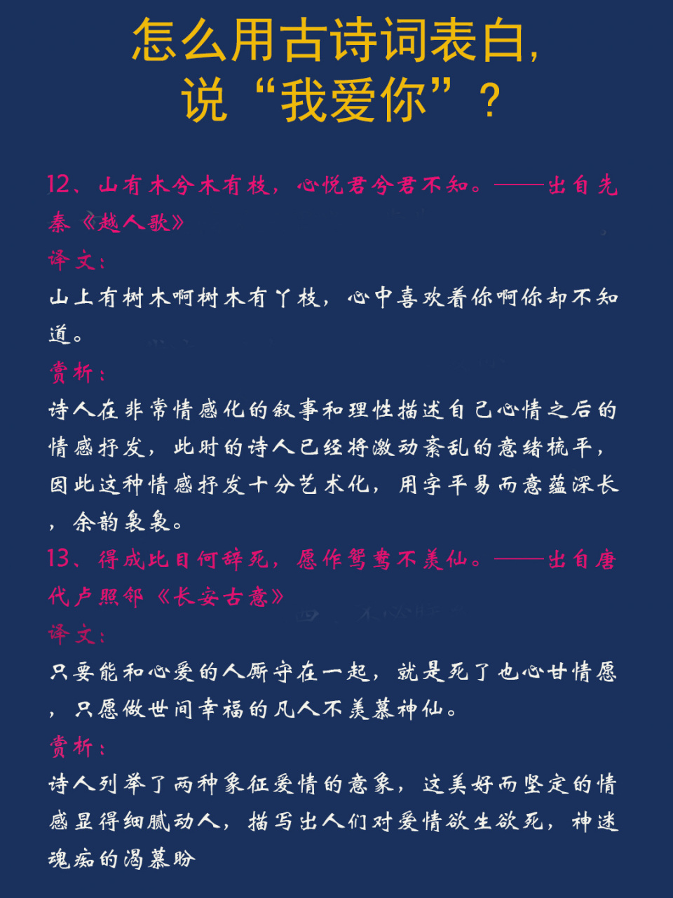 3、“山有木兮木有枝,心悦君兮君不知”的意思是山上有树木啊树木有丫枝,心中喜欢你啊你却不知此事“山有木兮木有枝”这是一个比喻,用山上的树木和树木的枝丫来起兴,引出下文的情感表达这里的“木”和“枝”都是自然界中常见的元素,通过它们的关联,暗示了人与人之间情感的复杂和微妙;“山有木兮木有枝,心悦君兮君不知”的意思是山上长有树木,树木长有树枝,我心里喜欢你你却不知道具体解析如下字面意思这句话通过自然景象来比喻人的情感状态,即我心中对你的喜欢就像山上树木长着树枝一样自然且显而易见,但你却不知道出处这句话出自越人歌,较早收录于西汉刘向的说苑中它是中国文学史上较早的明确歌颂恋;这一句话的意思是说山上有树木啊树木有丫枝,心中喜欢着你啊你却不知道 这一句话的出处是先秦·佚名越人歌 这一句话完整的原文是这样的 今夕何夕兮,搴舟中流 今日何日兮,得与王子同舟 蒙羞被好兮,不訾诟耻 心几烦而不绝兮,得知王子 山有木兮木有枝,心悦君兮君不知 这篇文章翻译;“山有木兮木有枝,心悦君兮君不知”的意思是我心里喜欢你,就像山上有树,树上有枝那样显而易见,然而你却不了解我对你的喜欢前半句解析“山有木兮木有枝”描述了一种自然景象,即山上生长着树木,树木上有树枝这种景象是普遍存在的,用来比喻情感的显而易见和自然而然后半句解析;这句话的意思是山中有树啊,树木上有枝条,我喜欢你啊,你却不知道原句为“山有木兮木有枝,心悦君兮君不知”此诗句出自先秦佚名越人歌,全诗原文如下今夕何夕兮,搴舟中流今日何日兮,得与王子同舟蒙羞被好兮,不訾诟耻心几烦而不绝兮,得知王子山有木兮木有枝,心悦君兮;“山有木兮木有枝,心悦君兮君不知”的意思是山有树木陪伴,树木有其枝干相依,我的心喜欢你,而你却不知道这句话出自先秦的越人歌,以下是对这句话的详细解释自然之喻“山有木兮木有枝”以自然界中山与树树与枝的关系为喻,表明这种相依相伴的关系是自然而然顺理成章的情感之;“山有木兮木有枝,心悦君兮君不知”的意思是我心里喜欢你,而你却不曾察觉具体解释如下诗句直译“山有木兮木有枝”描述的是自然景象,即山上有树木,树上有枝条这部分作为起兴,引出后面的情感表达情感转折“心悦君兮君不知”是情感表达的核心,意味着我心里默默地喜欢着你,但遗憾。