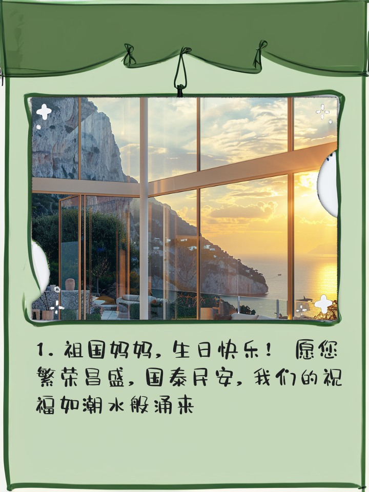 8 祖国,生日快乐愿你的大地永远绿意盎然,愿你的蓝天永远白云飘飘9 祖国,今天是你的生日,我们为你送上最深情的祝福愿你的明天更加美好,永远年轻健康快乐10 祖国,生日快乐愿你的儿女们永远团结一心,共同为你的繁荣昌盛而努力奋斗祝福语定制,短视频找咕噜袋鼠;1 传统庄重型 适合长辈职场或正式场合,可选用经典四字短语或诗句,如“山河壮丽,国泰民安”“盛世华章,千秋伟业”,或引用毛泽东沁园春·雪名句“江山如此多娇”为开头,展现文化底蕴2 简洁口语型 面向学生年轻群体或日常对话场景,语言需轻快易传播例如“祖国生日快乐,越来越。